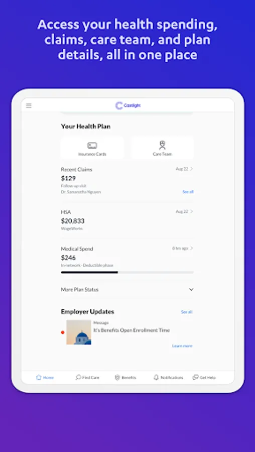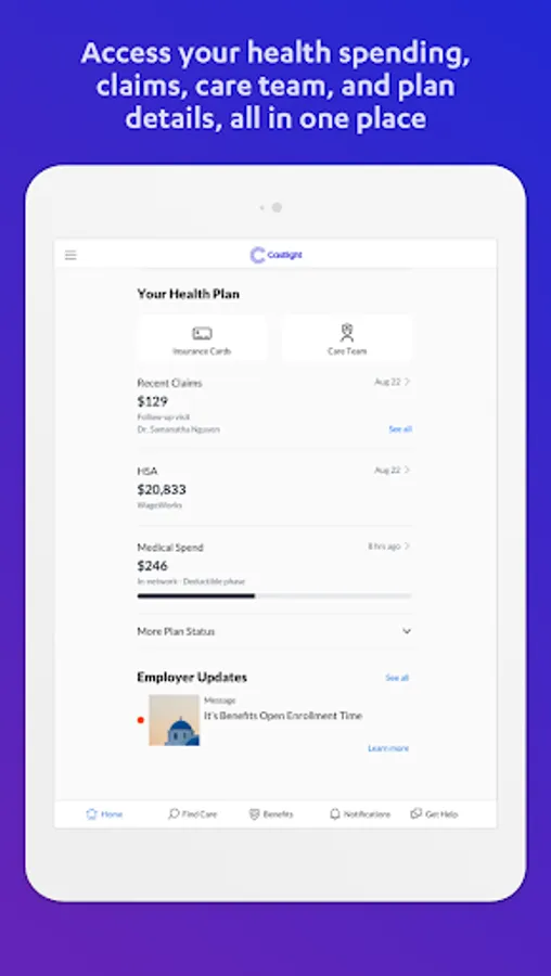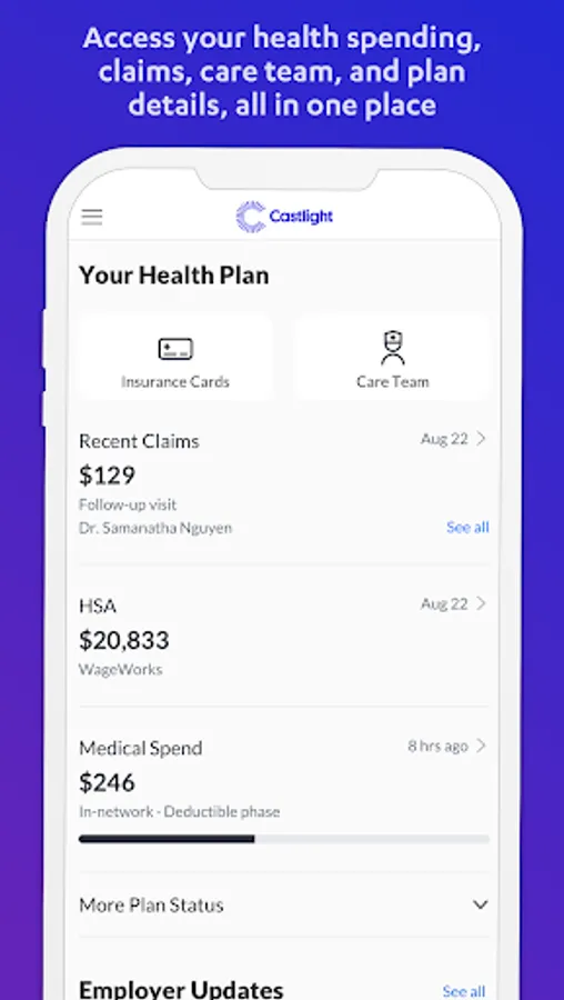 Plan status - Track how much of your deductible you’ve met, see your HSA balance, and review basic information about your health coverage all in one place.