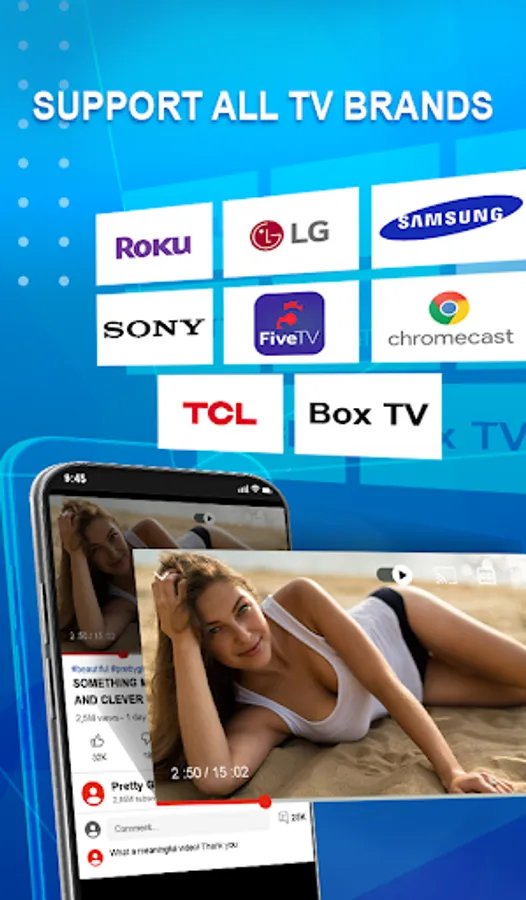 You can cast local and web films, music, and photos to your TV, Chromecast, RokuTV, Amazon FireTV or Fire Stick, Xbox, Apple TV, or other DLNA devices with Cast to TV. Stream videos and movies on TV right now by casting to TV!