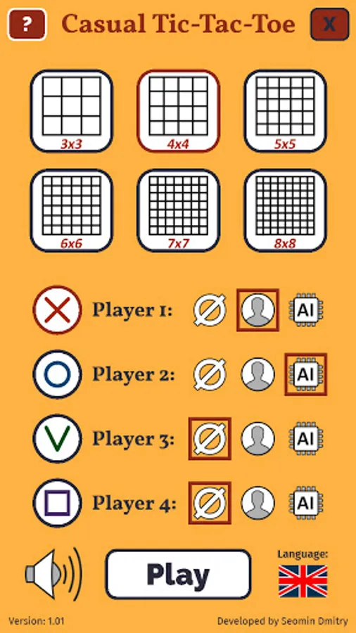 This is a variation of the classic puzzle game, in which players take turns putting their signs on the free cells of the field and the first one to line up three of their pieces wins.Here you can choose different grid fields, and the party can take part up to four people, on one device, which can be both your friends and the AI.