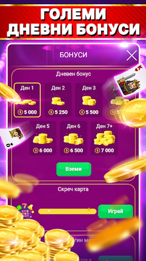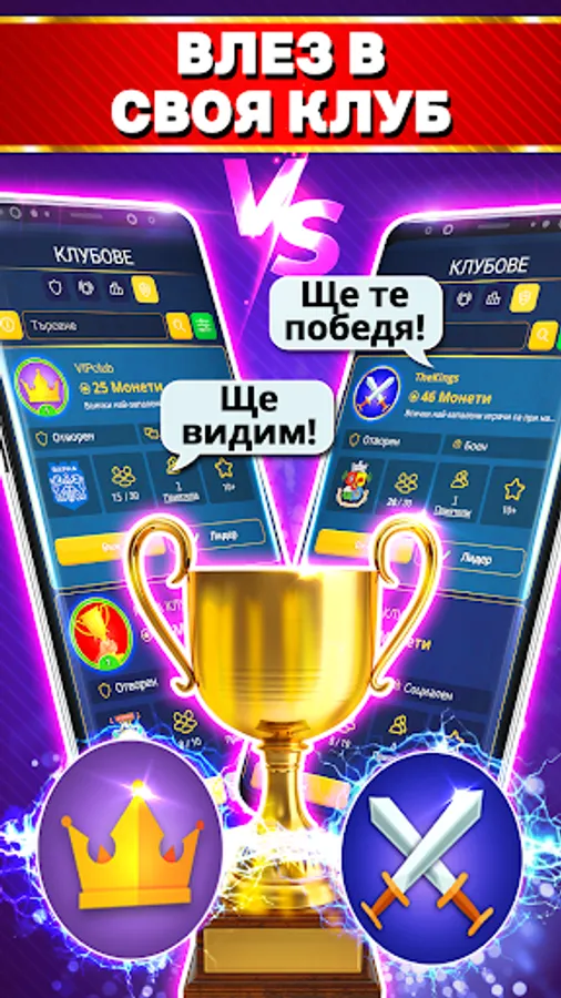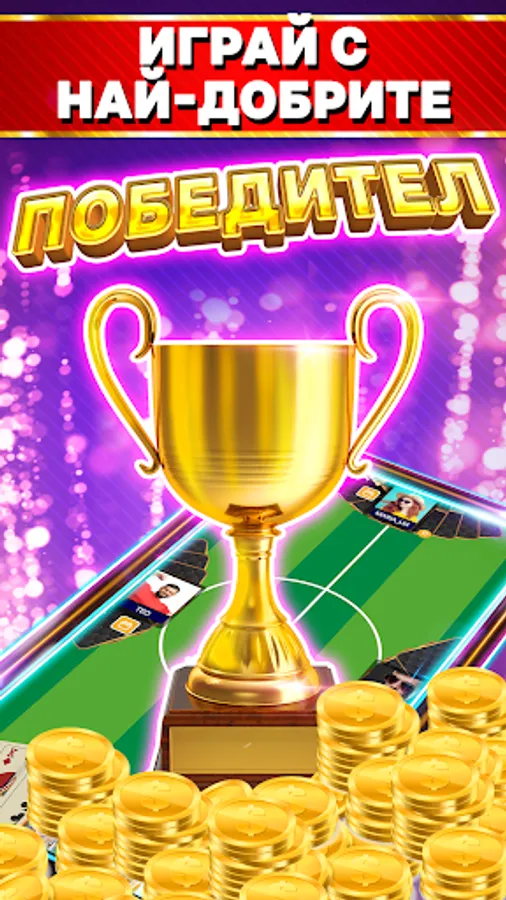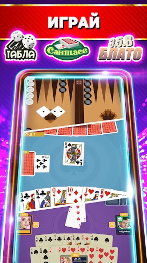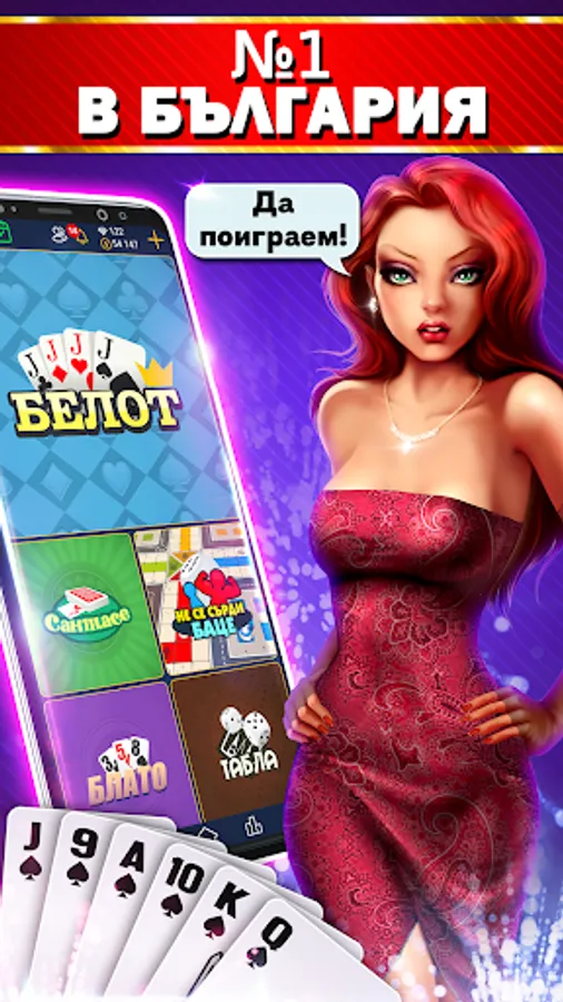 When entering BelotBG, choose which of our five games you want to switch to - Belot, Don't Be Angry, Man, Santase, Backgammon or Swamp. Each of them has its own rooms and tournaments. We added real-time chats in rooms with friends, 3 daily missions, "KNOCKOUT" elimination in tournaments.