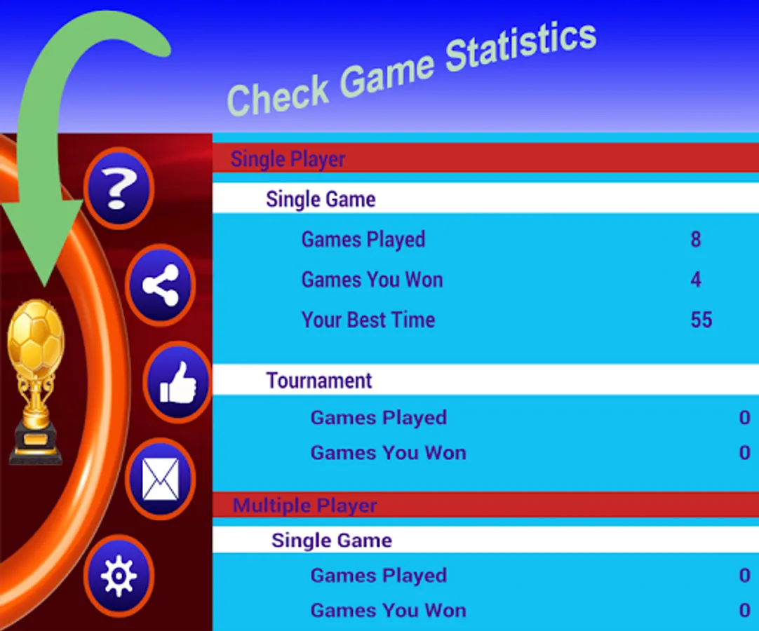 --> Keep track of how many games you played, how many you won and your best score so far
