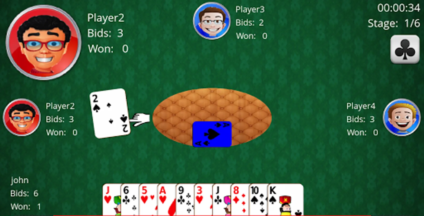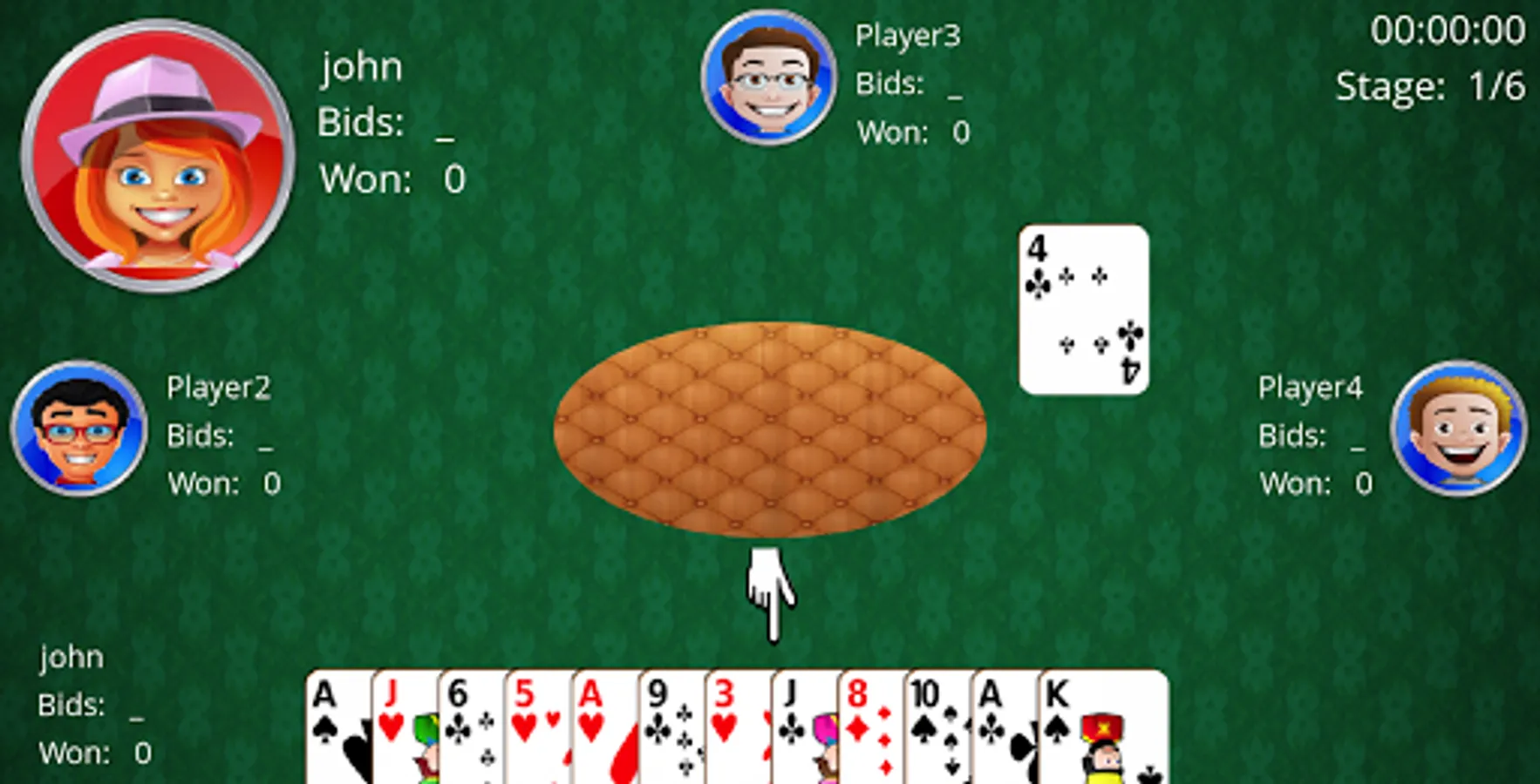 The game has 6 stages. The first stage starts with 12 cards per player. At each stage, the number of cards per player decreases by one until it reaches 7 in 6th stage. At this point, the total cumulative score decides the winner of the game.