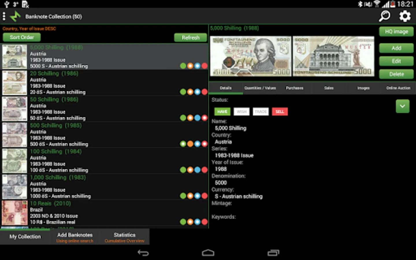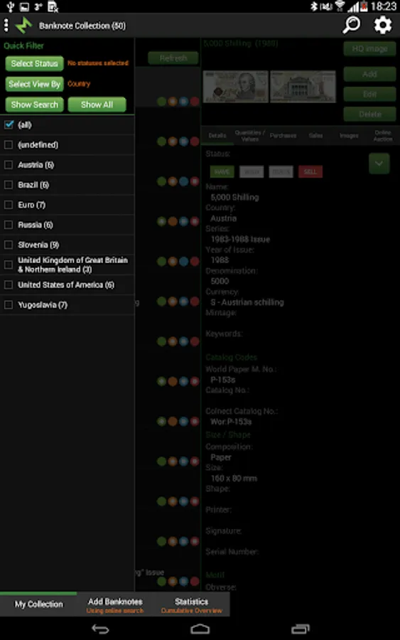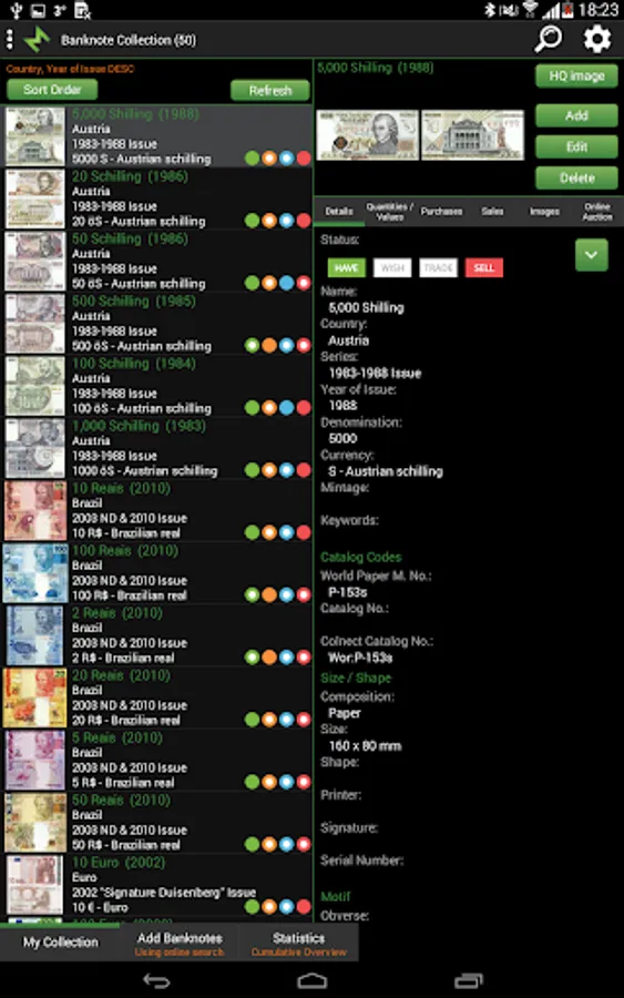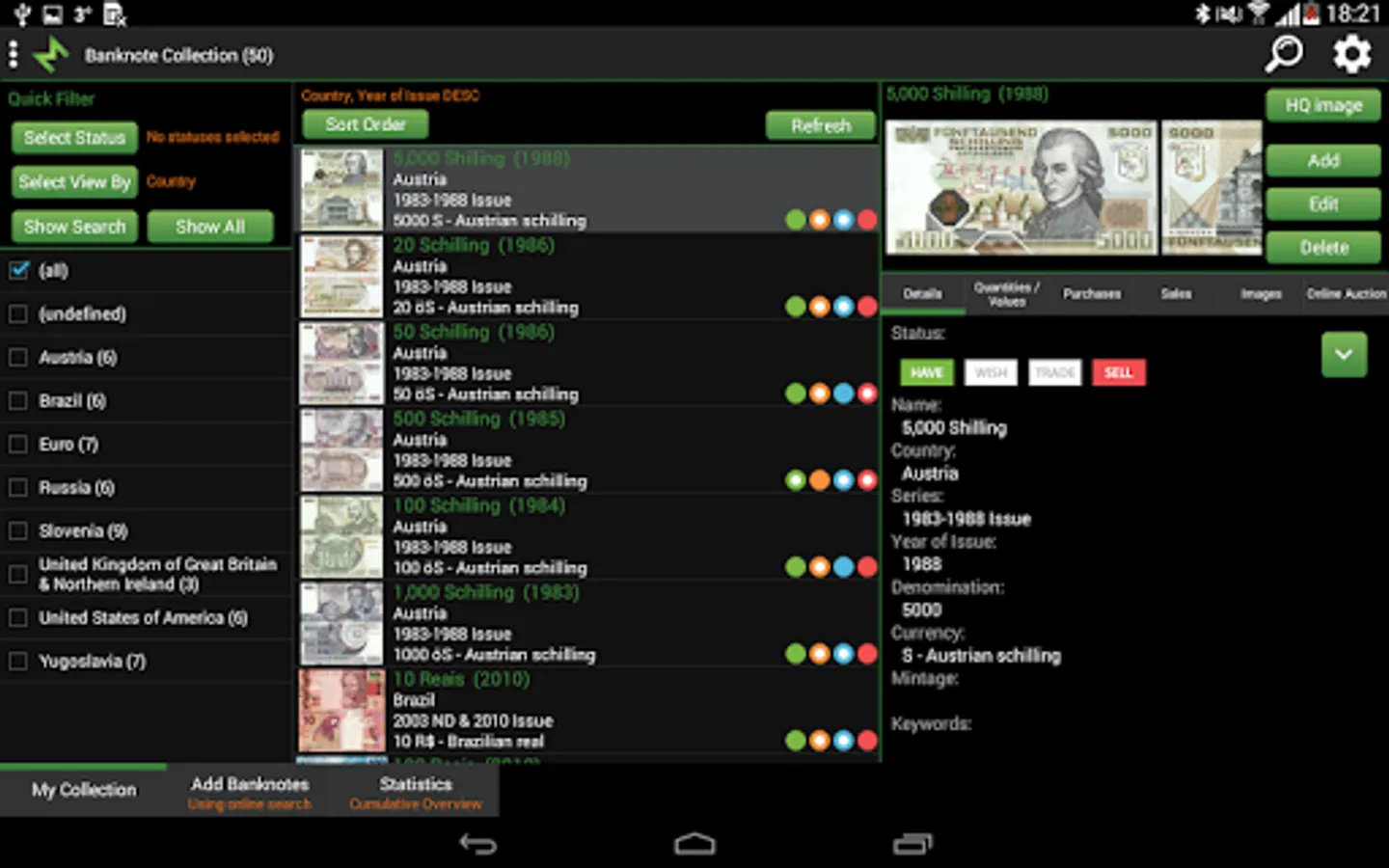 Tag your banknotes with Have, Wish, Trade and Sell status by simple click on status button or customize your own status list.