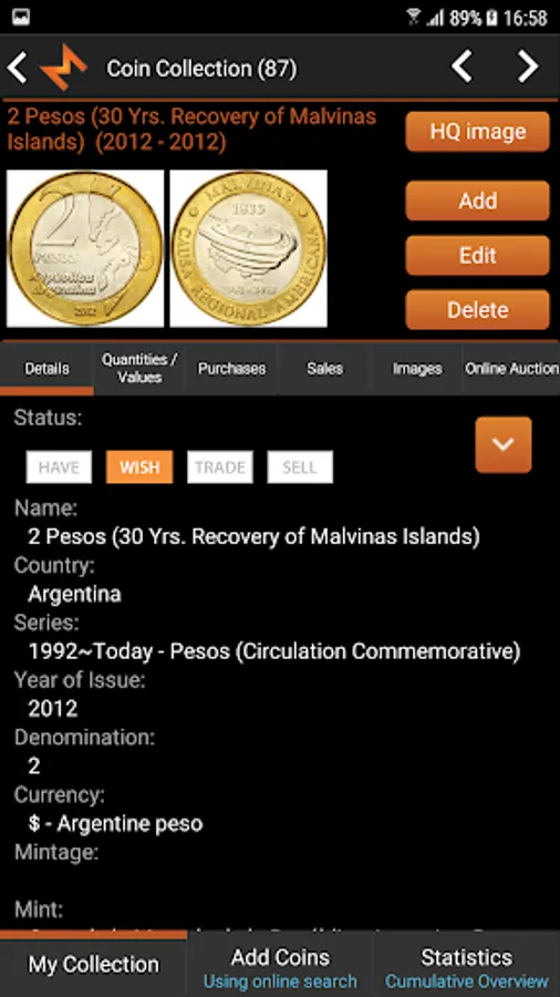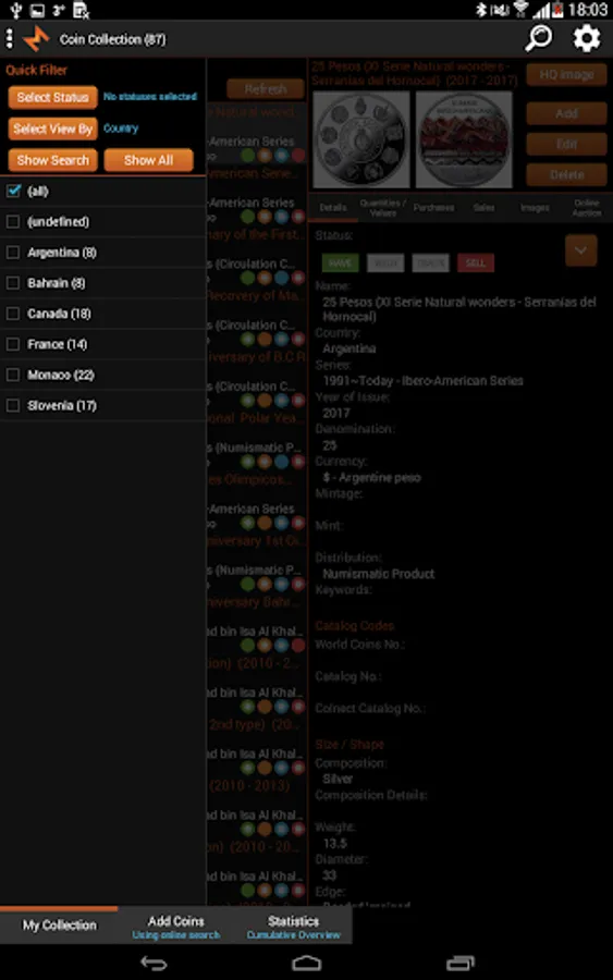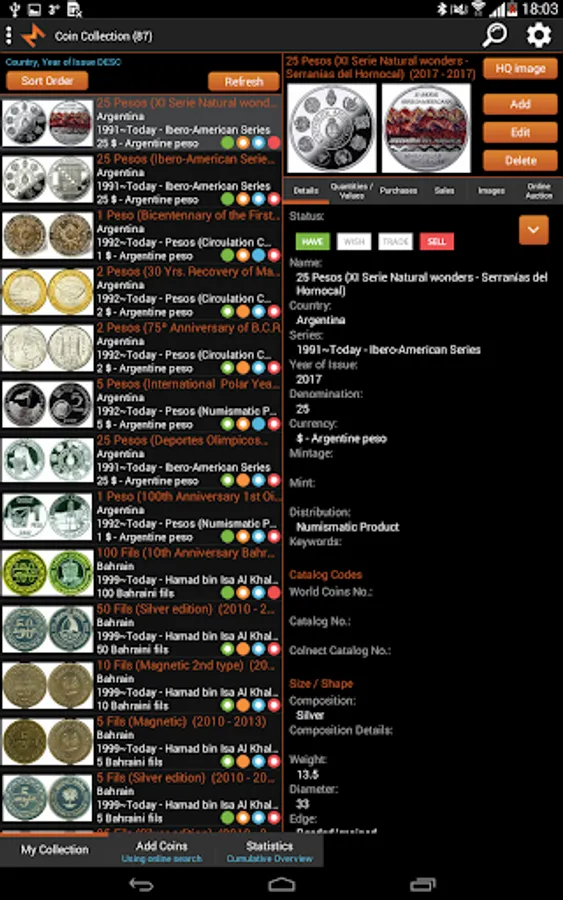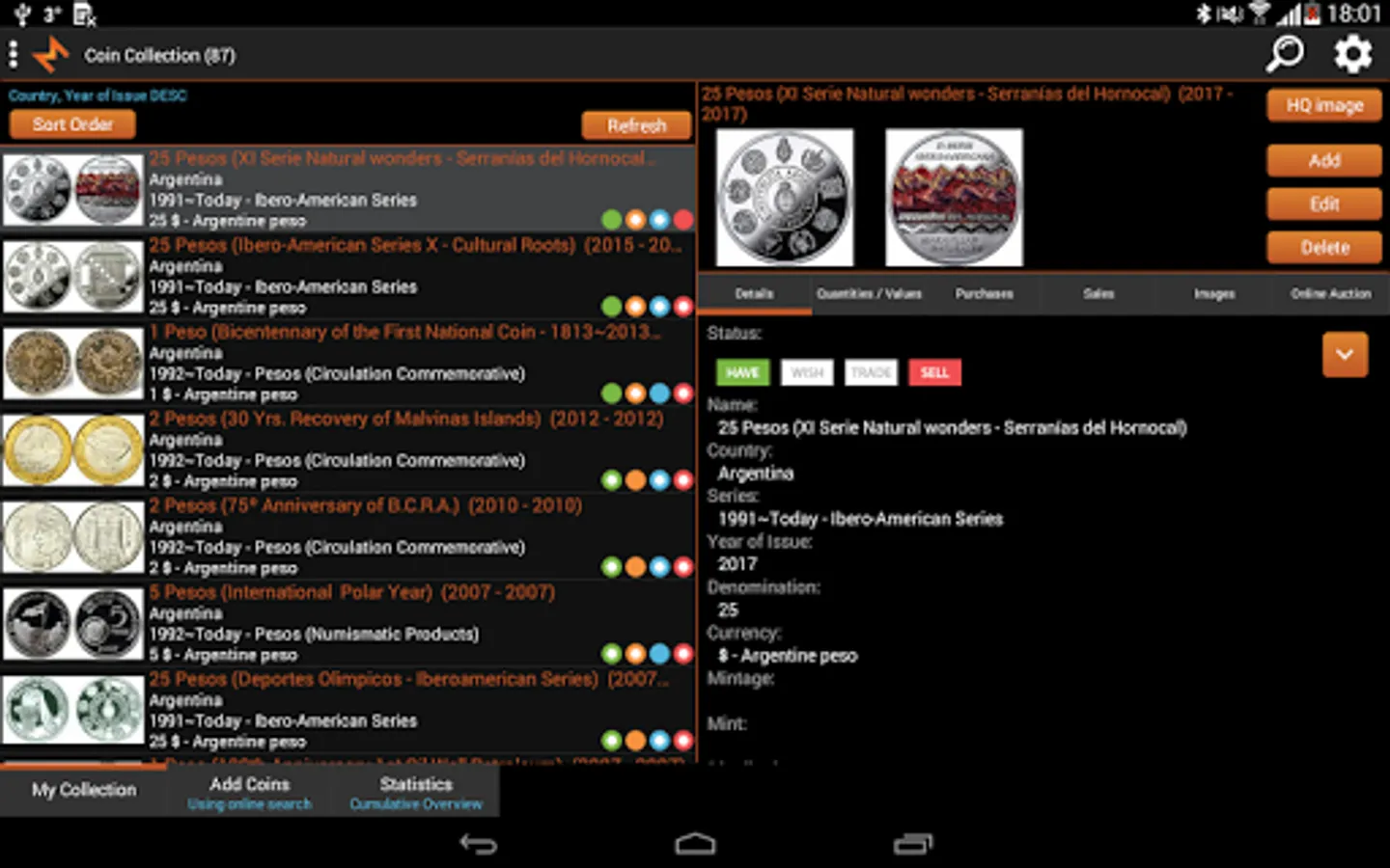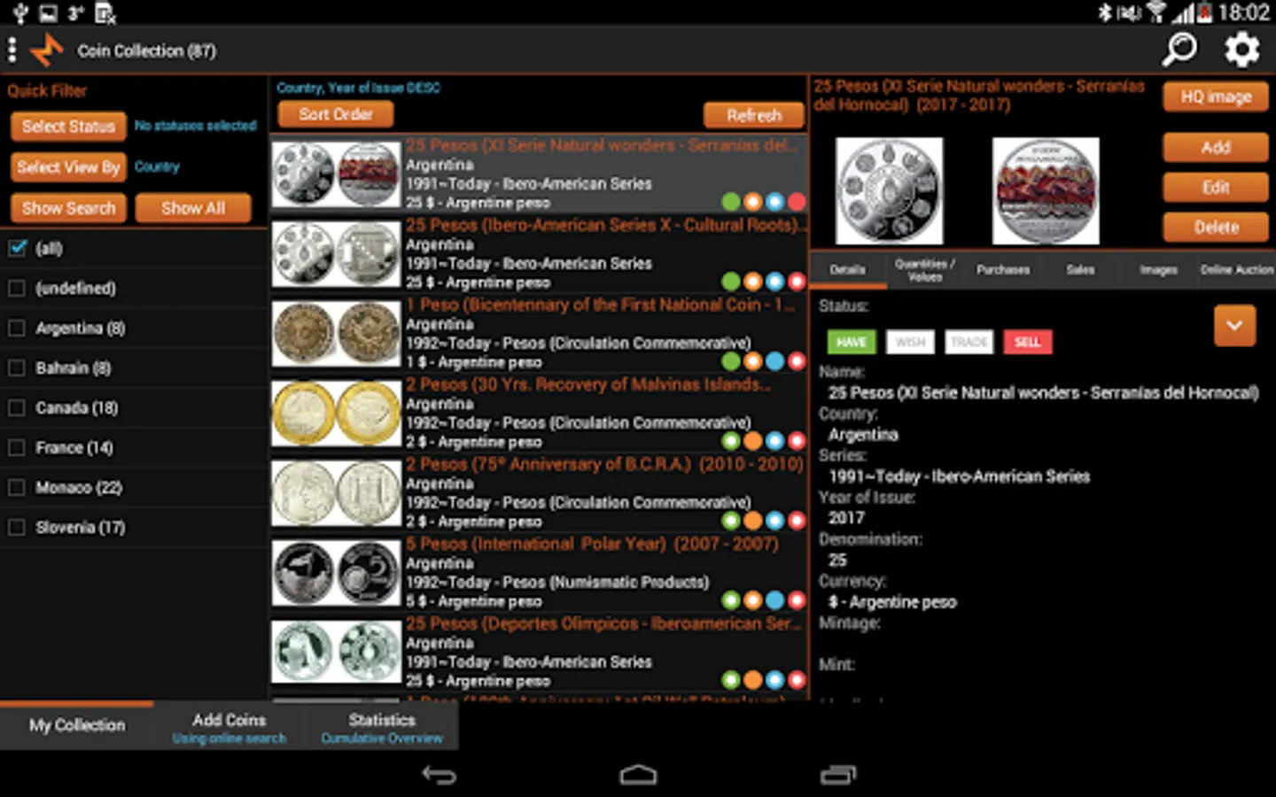 Tag your coins with Have, Wish, Trade and Sell status by simple click on status button or customize your own status list.