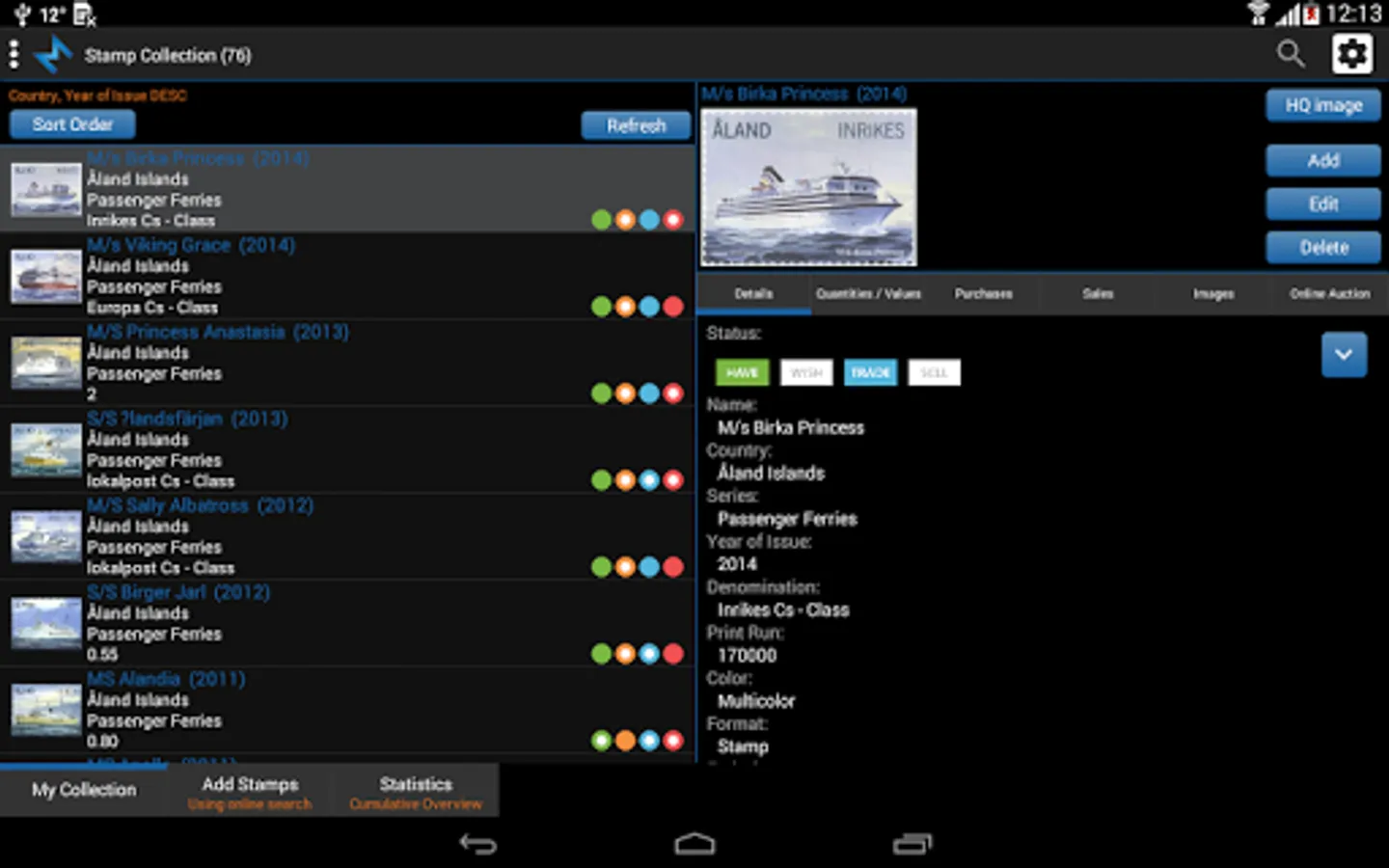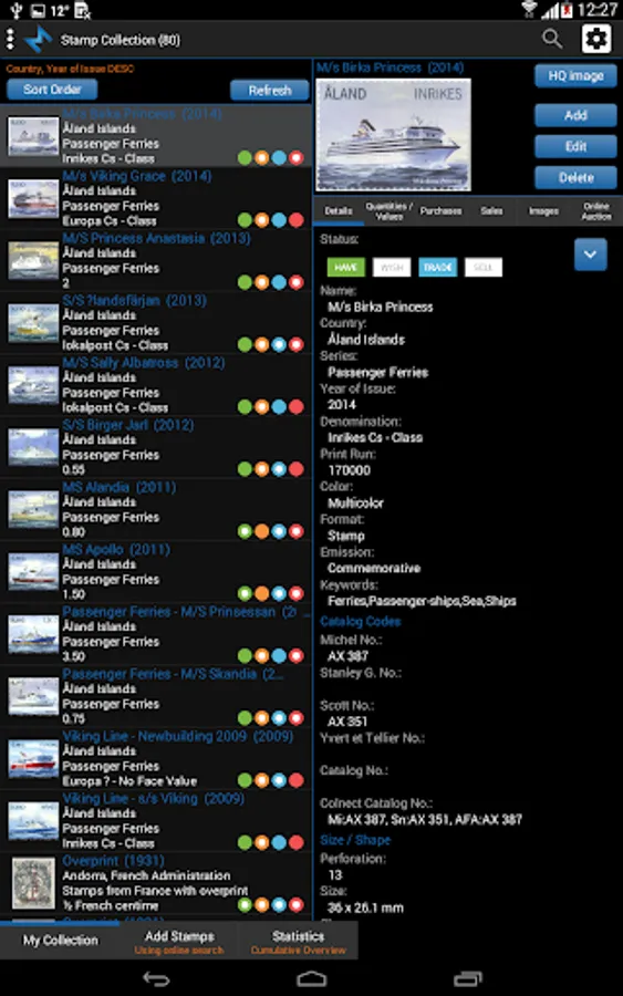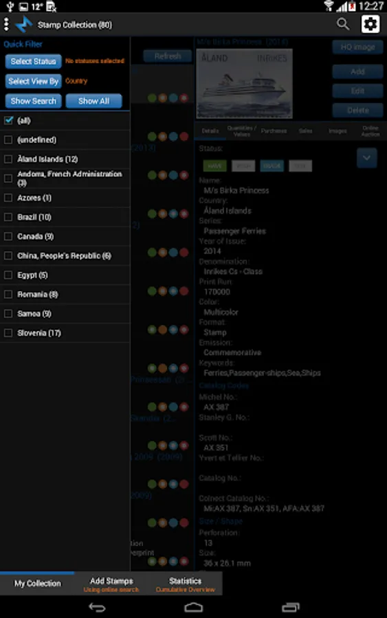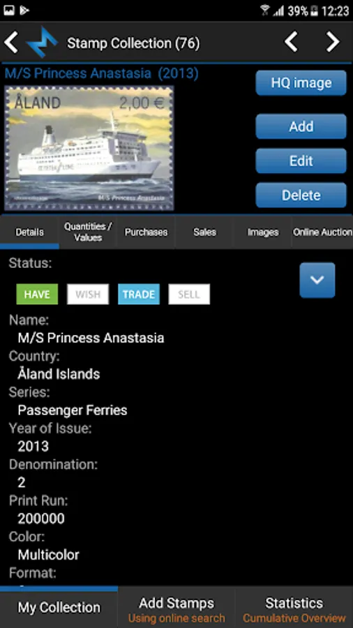 Tag your stamps with Have, Wish, Trade and Sell status by simple click on status button or customize your own status list.