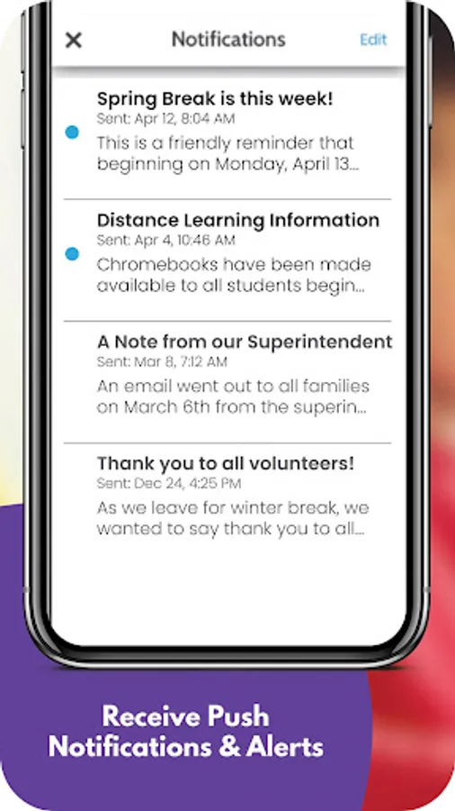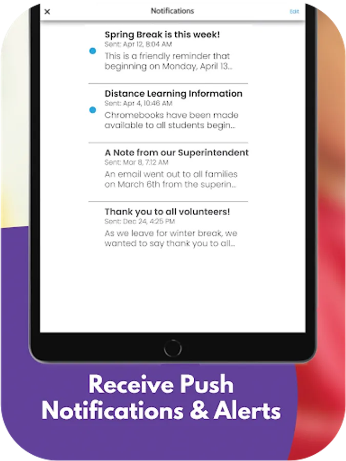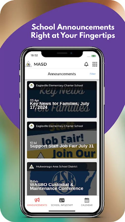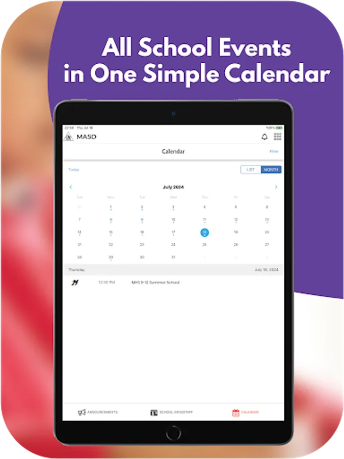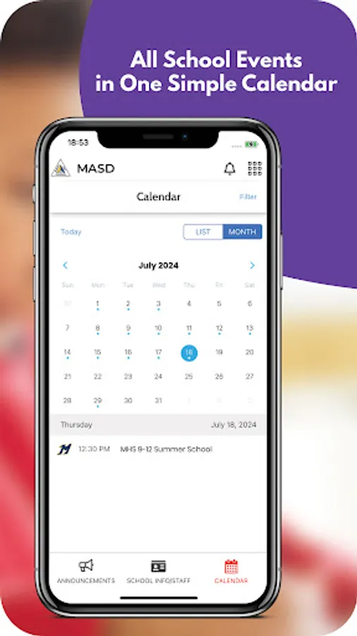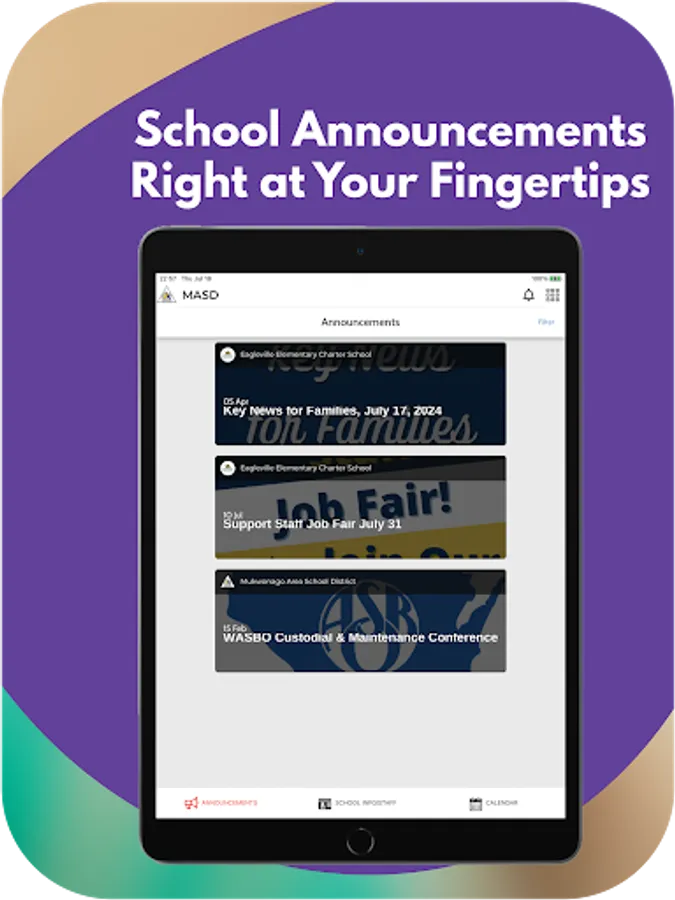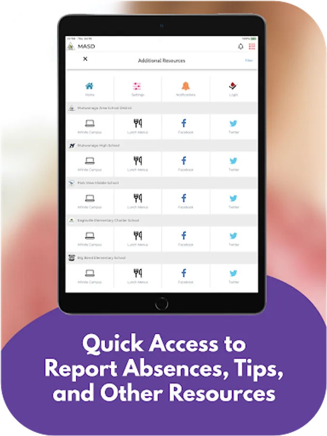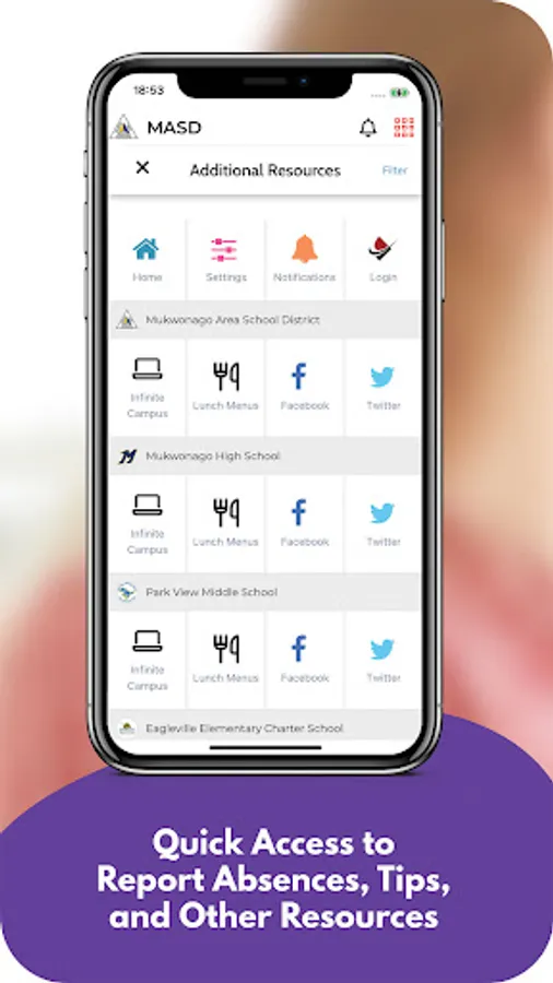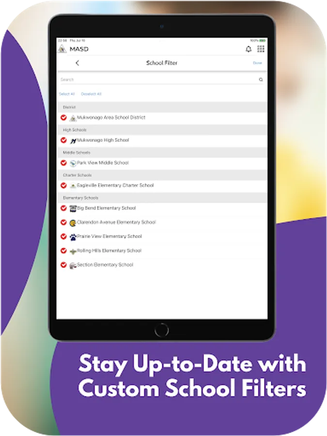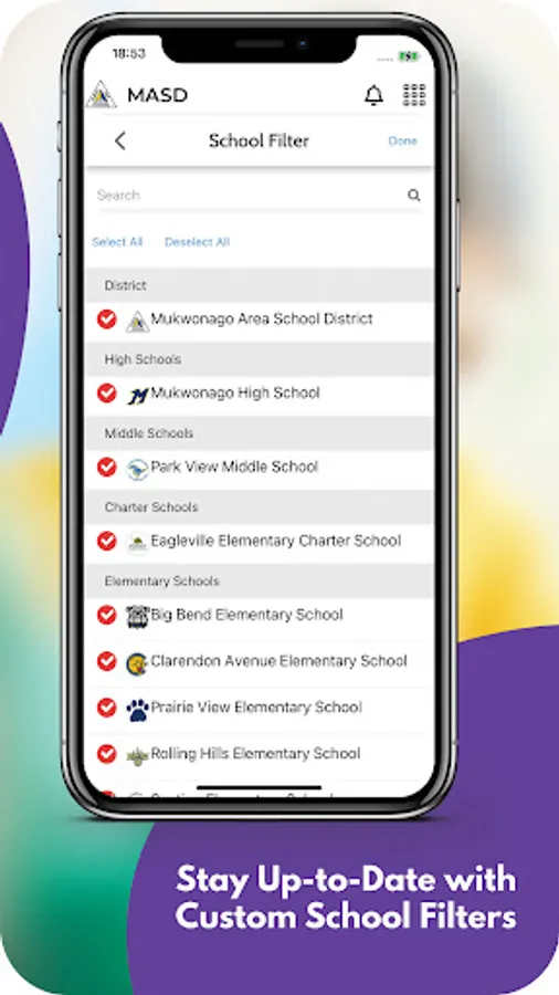 The app includes information for the district and all schools. Filter by the school your child attends to feature information for that school.