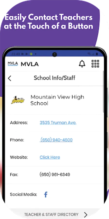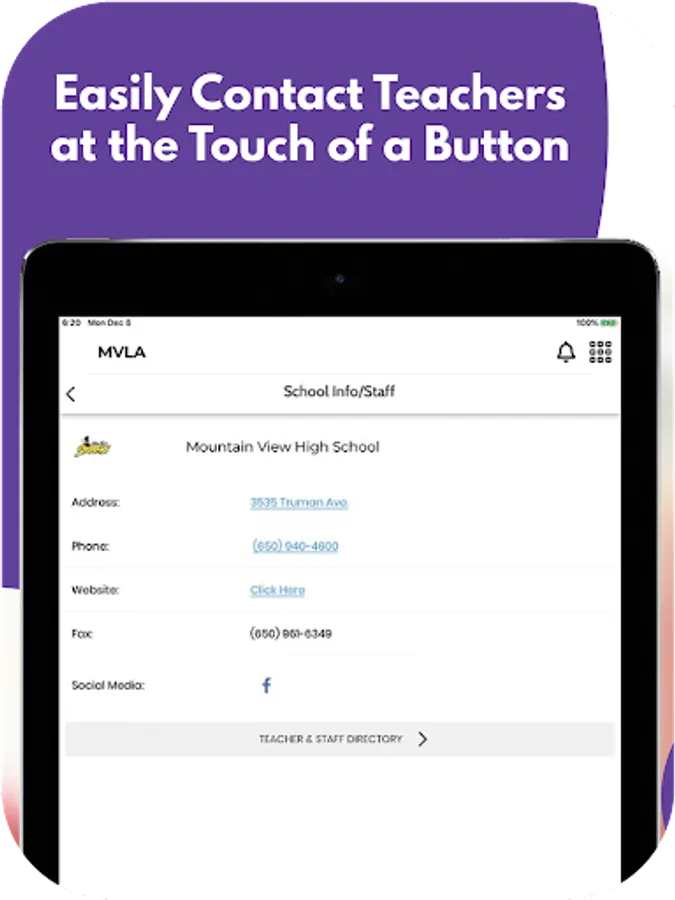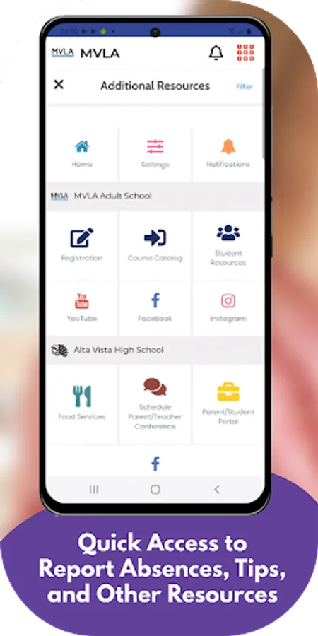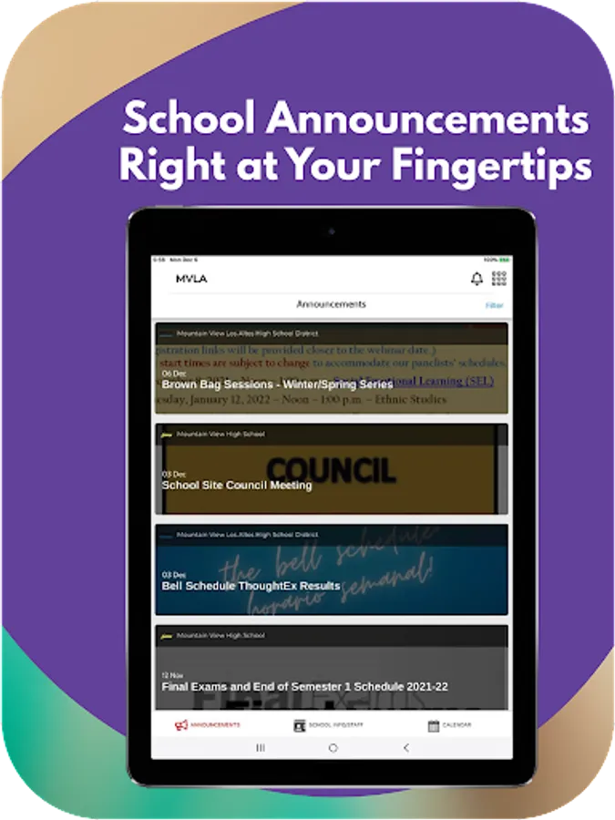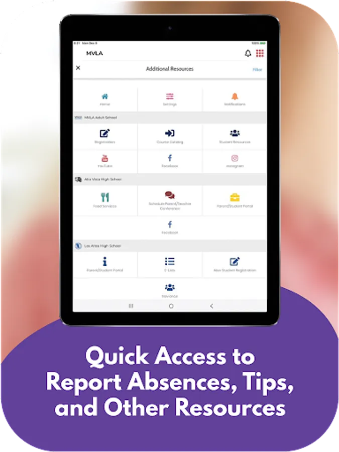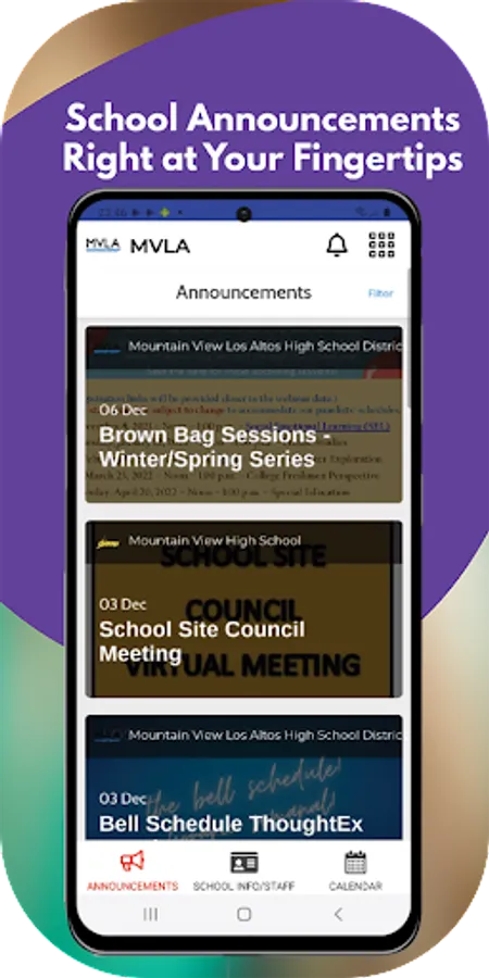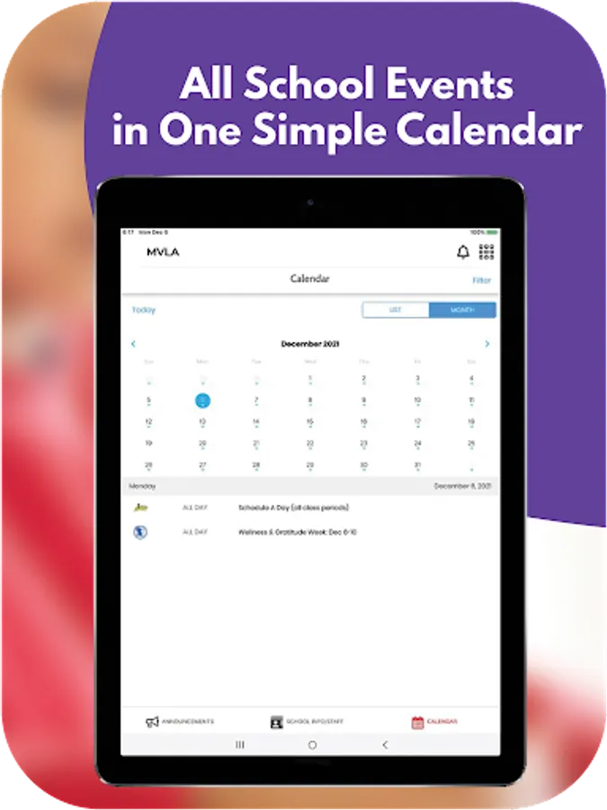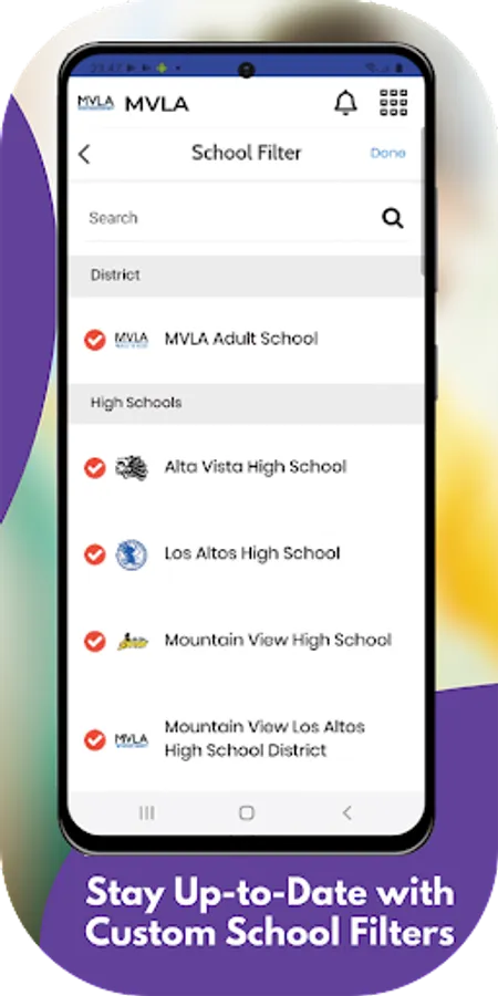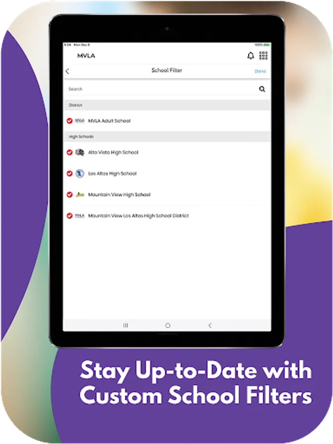 The app includes information for the district and all schools. Filter by the school your child attends to feature information for that school.