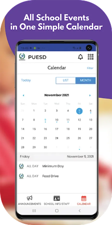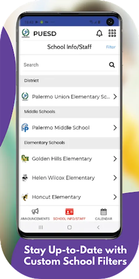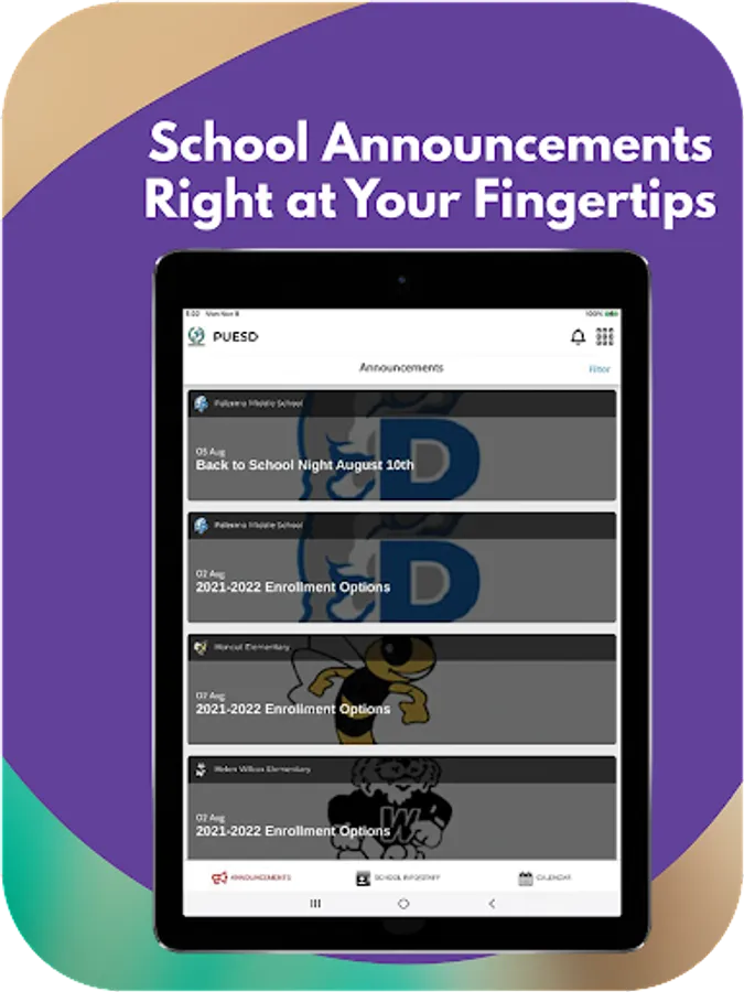 The app includes information for the district and all schools. Filter by the school your child attends to feature information for that school.