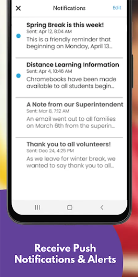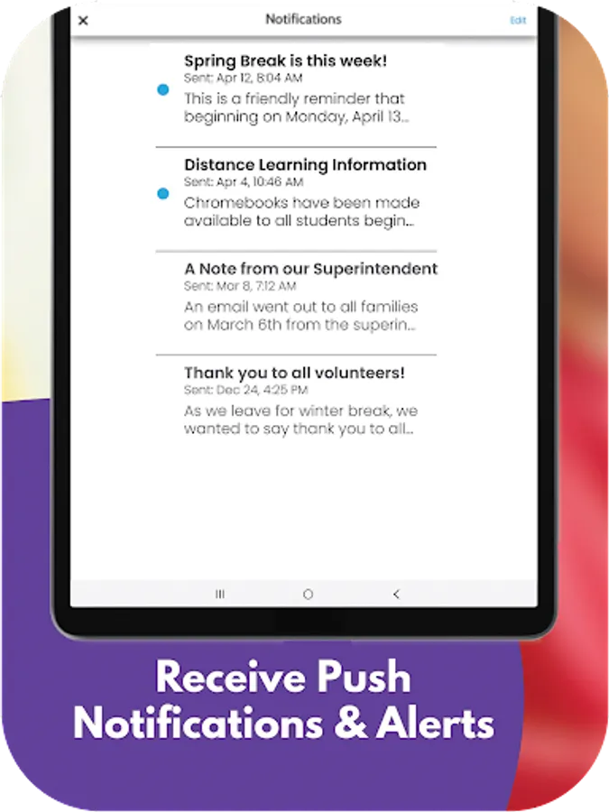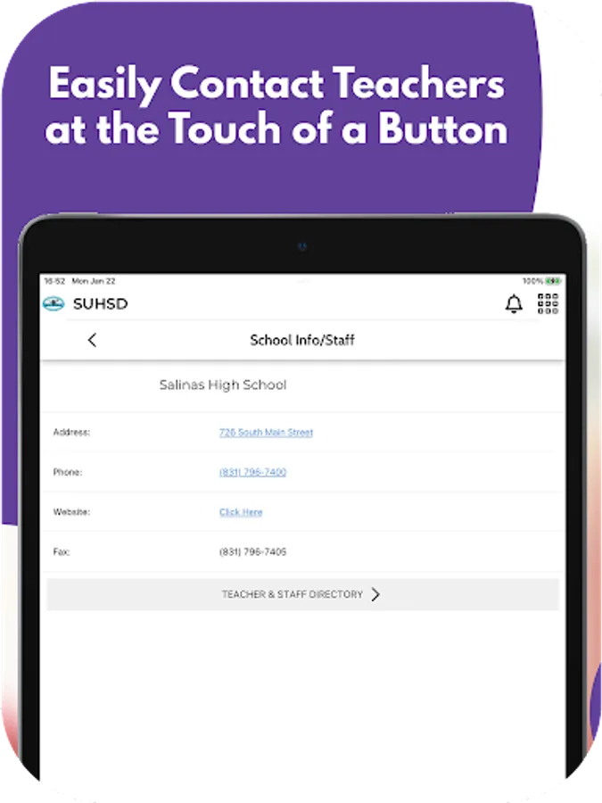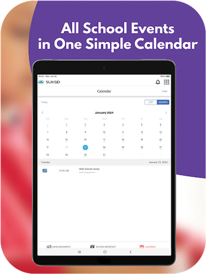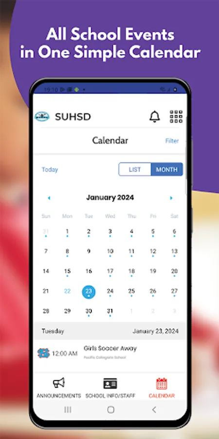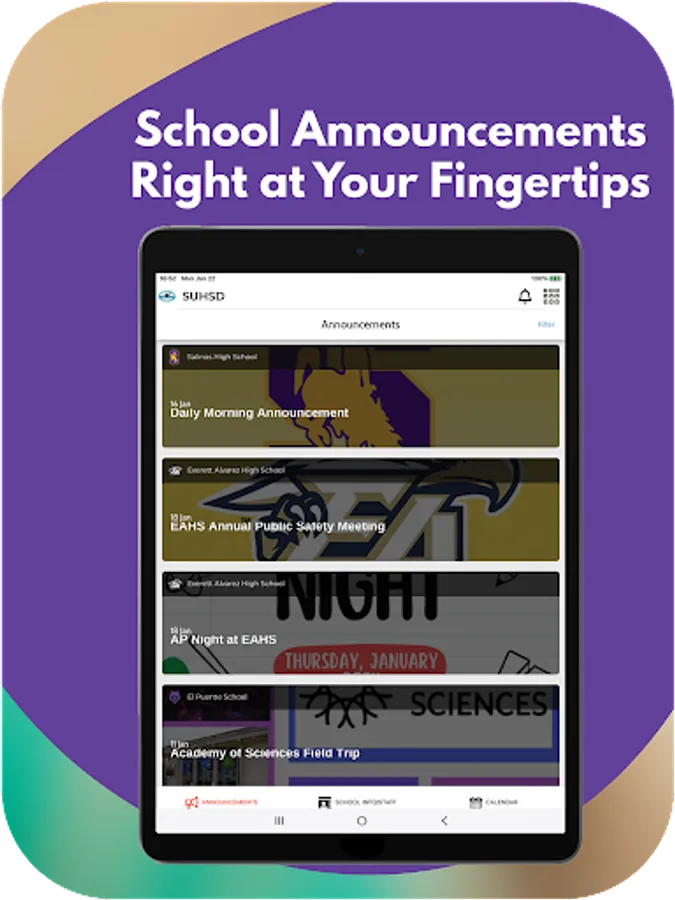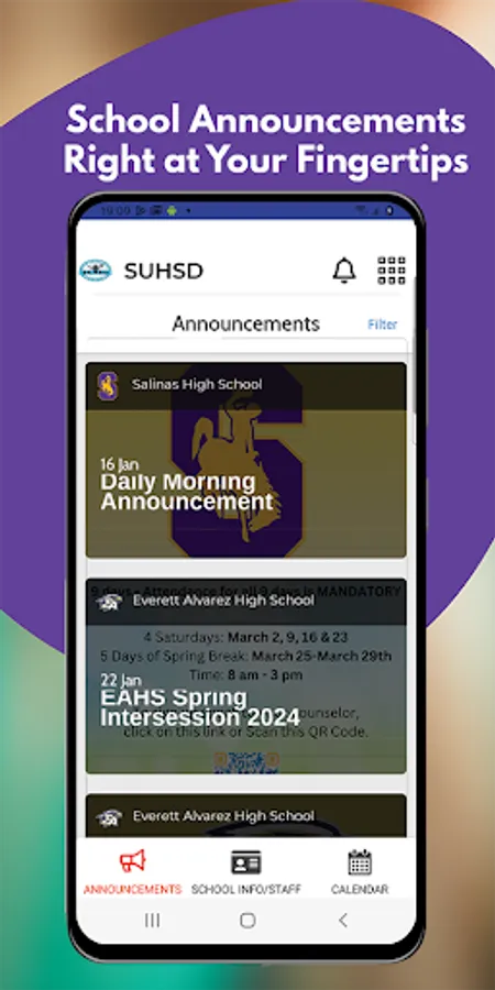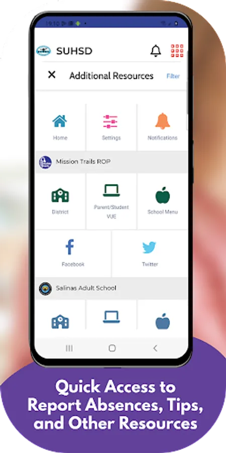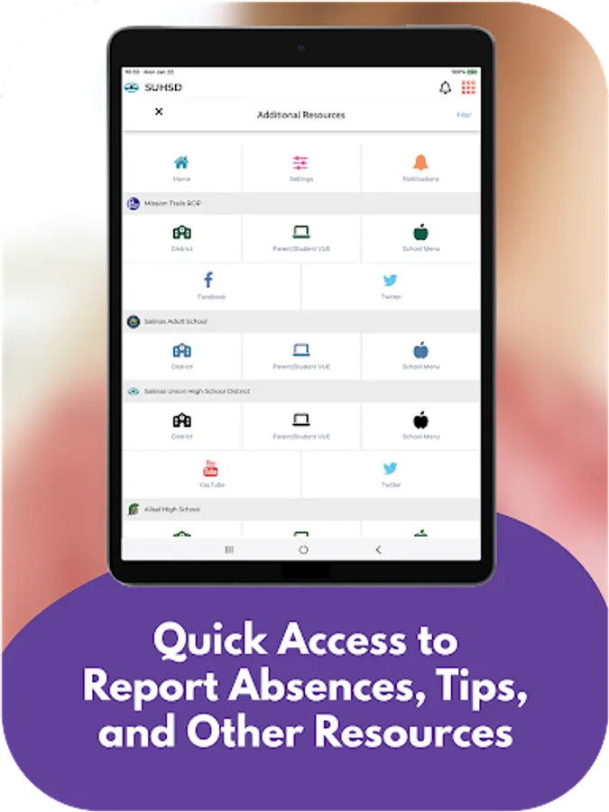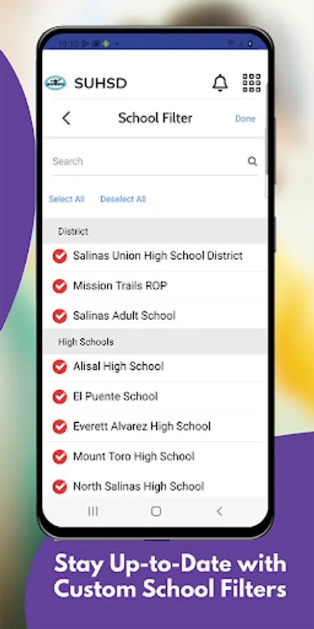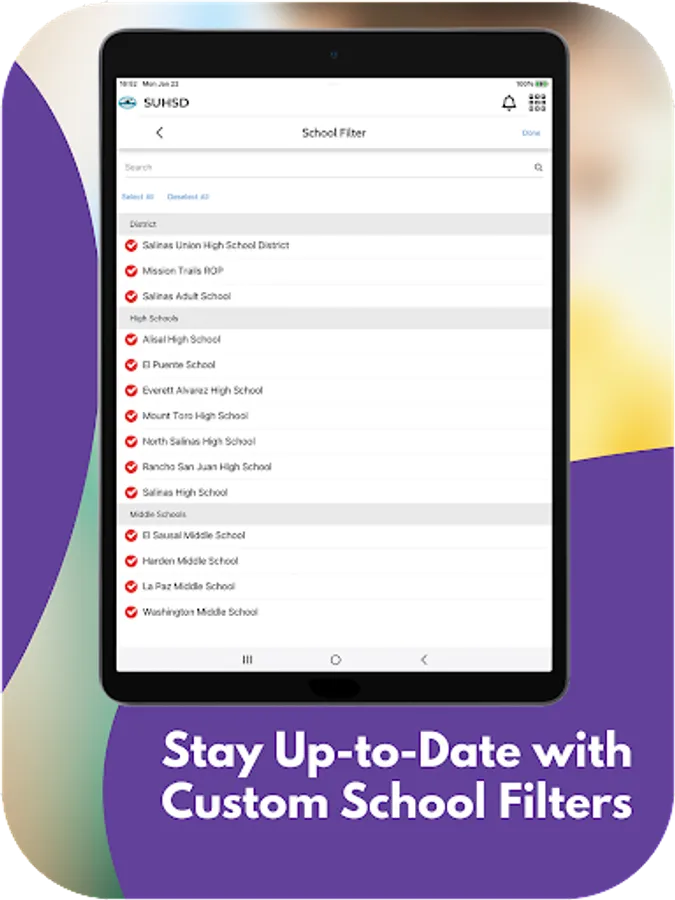 The app includes information for the district and all schools. Filter by the school your child attends to feature information for that school.