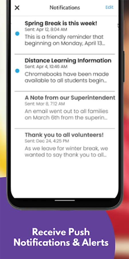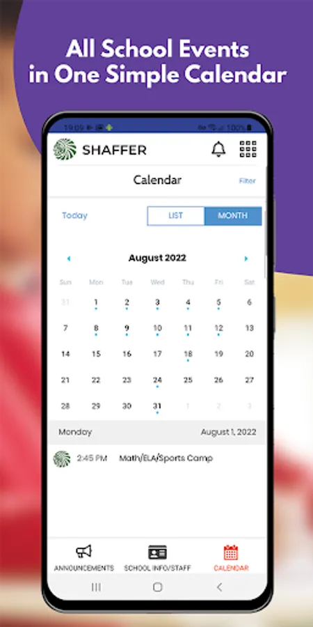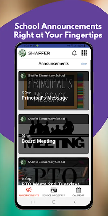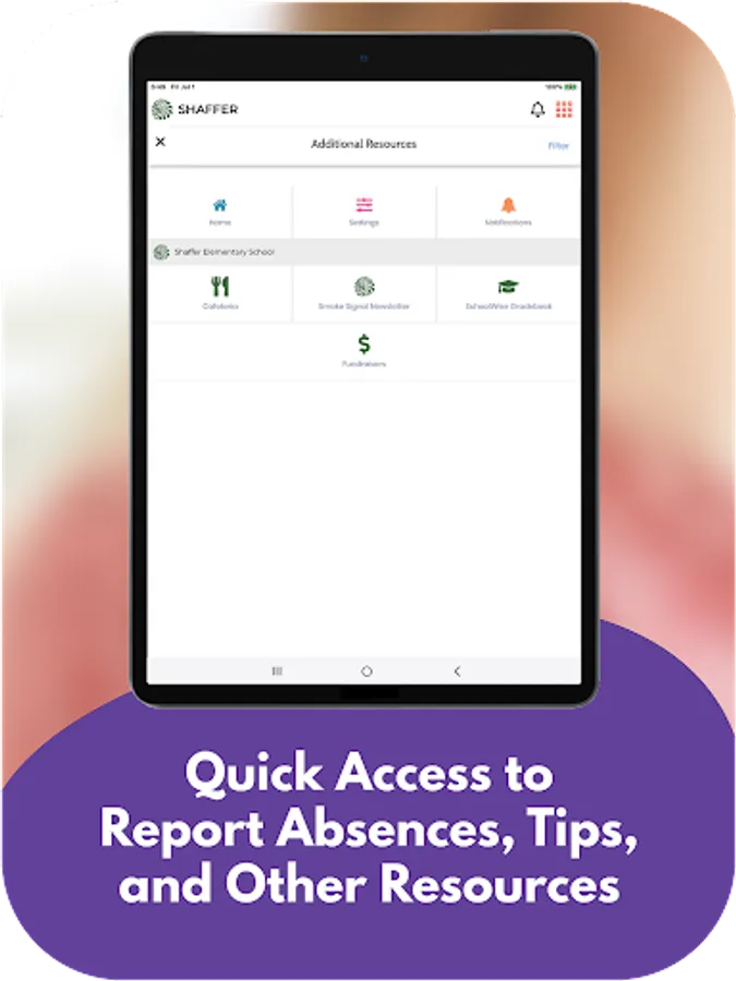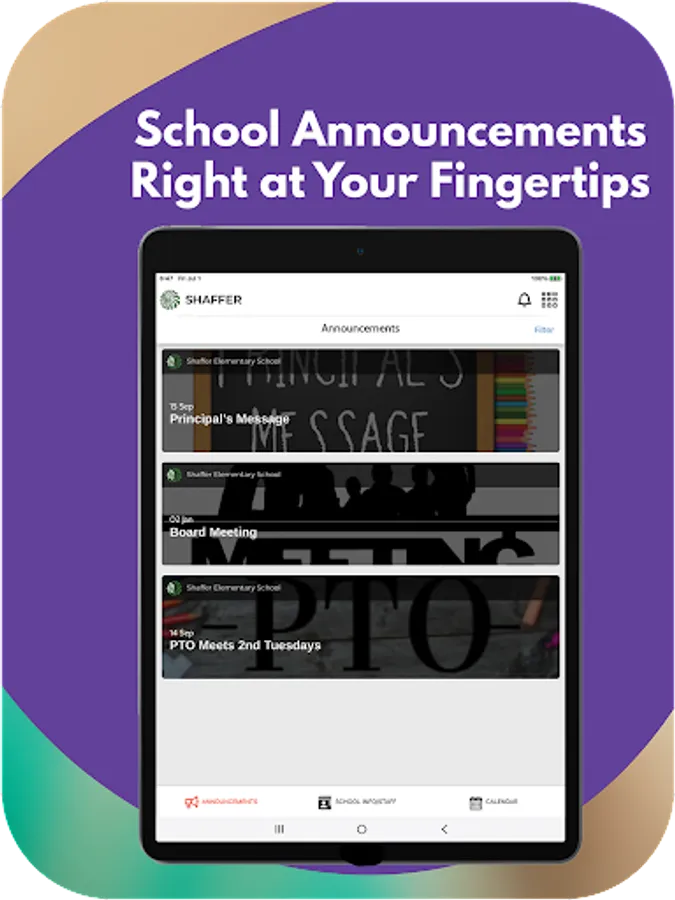 The app includes information for the district and all schools. Filter by the school your child attends to feature information for that school.