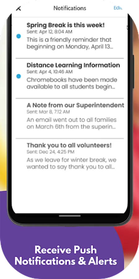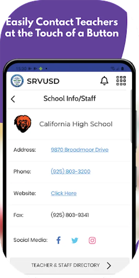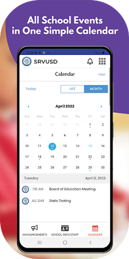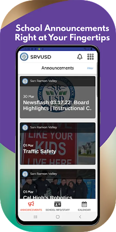The app includes information for the district and all schools. Filter by the school your child attends to feature information for that school.