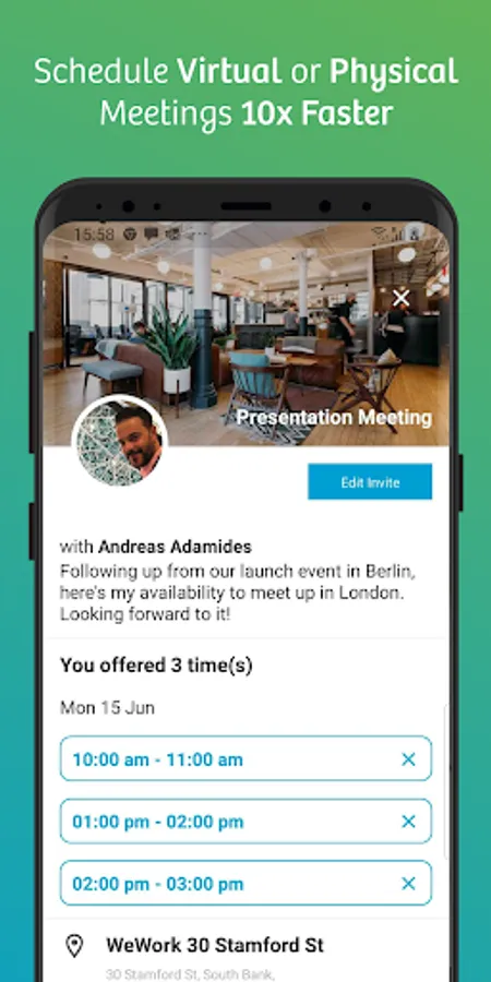 • CUSTOMISED & POWERFUL: Select the times you ‘d like to offer to your invitee, the location (address, or specific place), meeting agenda, and more.