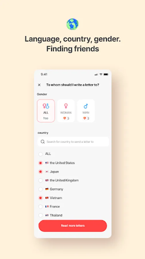You can send a letter directly to any country you want. Choose the country you want and deliver the letter!