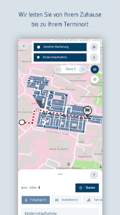 Use the UKSH app to navigate to your destination on the UKSH campus or to one of its properties. The goals and the ways to get there are kept up to date. In the settings you can specify whether paths for people with restricted mobility should be displayed so that unpaved paths and stairs are avoided. Here you can also set whether you have a disabled parking permit, so that we can always navigate you to the nearest parking space.