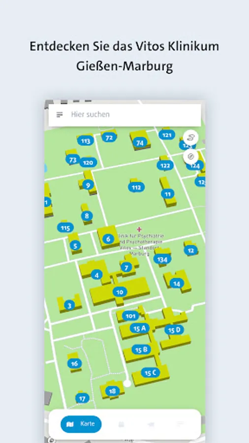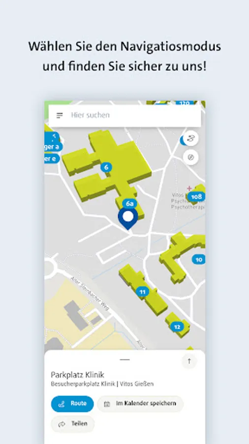 With the new Vitos Navi you can navigate our grounds. If you are traveling by car, you will be directed to the nearest parking lot, if you wish, before continuing on foot. We also consider routes for people with restricted mobility so that you can always reach your destination safely.