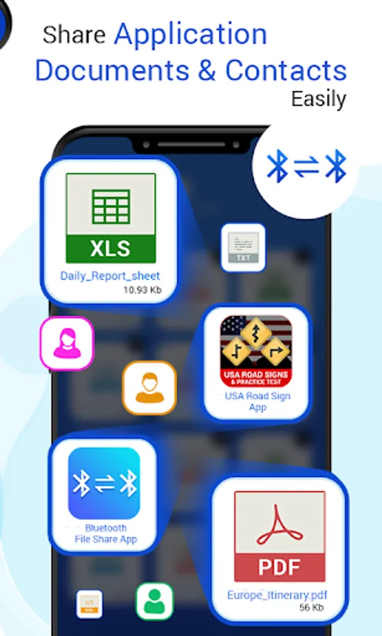 Bluetooth File Sharing application to Share Photos, Videos, Music, Documents, Apps, Contacts with your Friends and Family over Bluetooth easily and speedily.