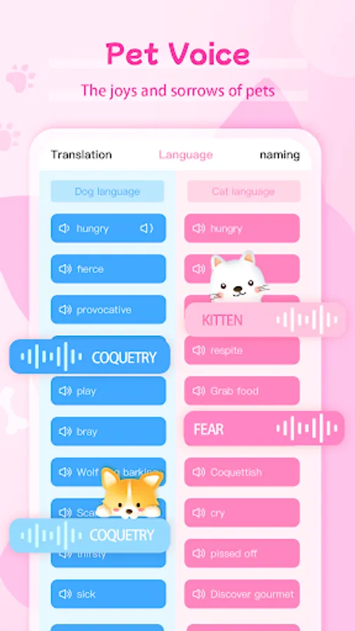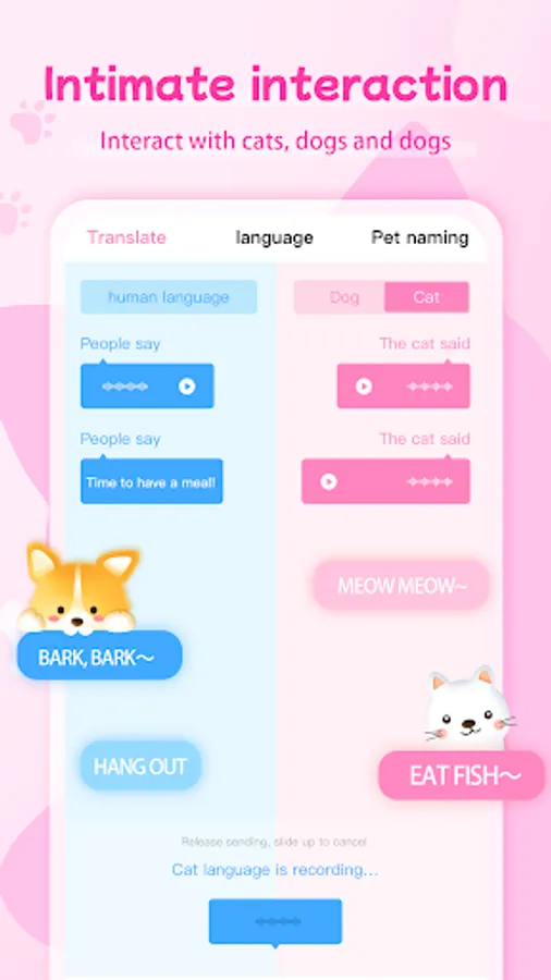 The cat language and dog language translator changes your voice into cat language and dog language in time, and listens to the heartfelt voice of cats and dogs. Let owners and pets be closer and communicate with pets more easily.