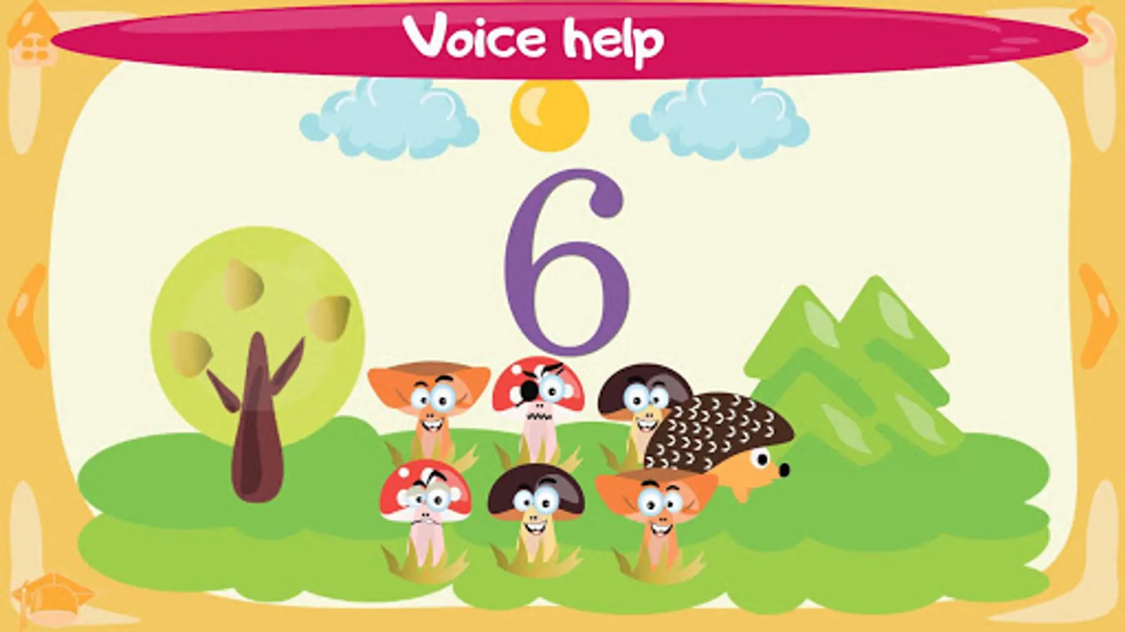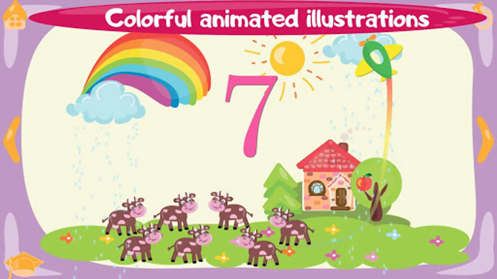 Each figure is presented in such a way that a kid can easily remember it. Bright animated picture and a rhyme voiced by a speaker will help him. Images “come alive” when you click on it. A kid can turn on rain, wake up a bear, feed a frog, etc.