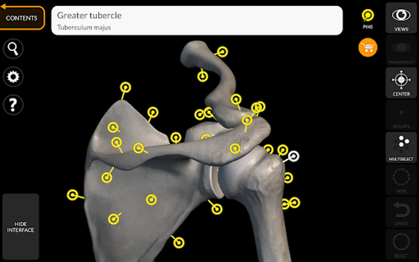By selecting models or pins you will be shown the terms related to any specific anatomical part, you can select from 11 languages and show the terms in two languages simultaneously.