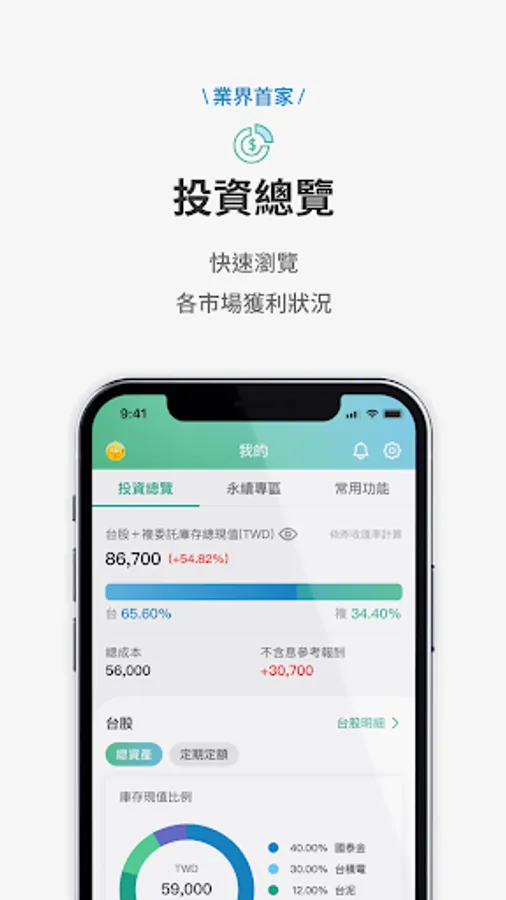 2. Investment overview: presents the investment performance of the whole market in Taiwan dollars, and visually presents the daily inventory information of Taiwan, the United States and Hong Kong.