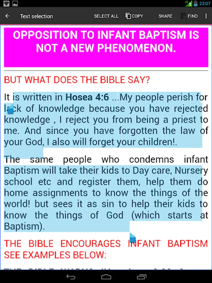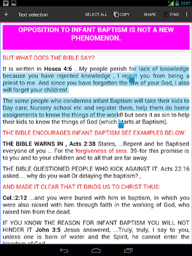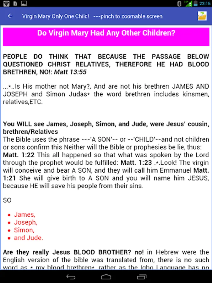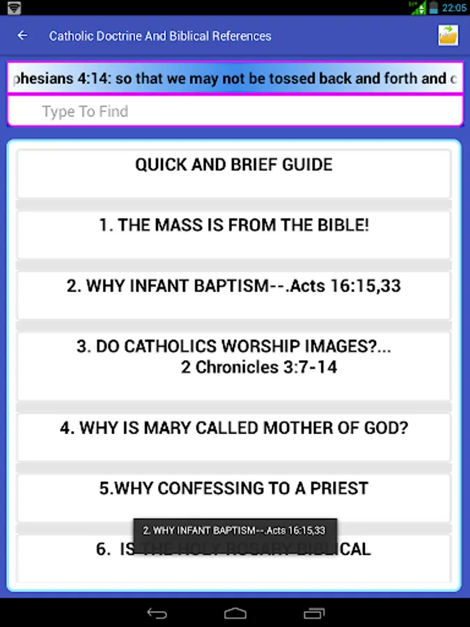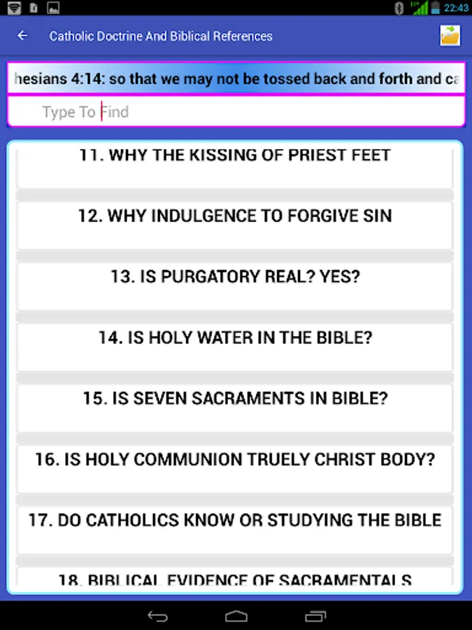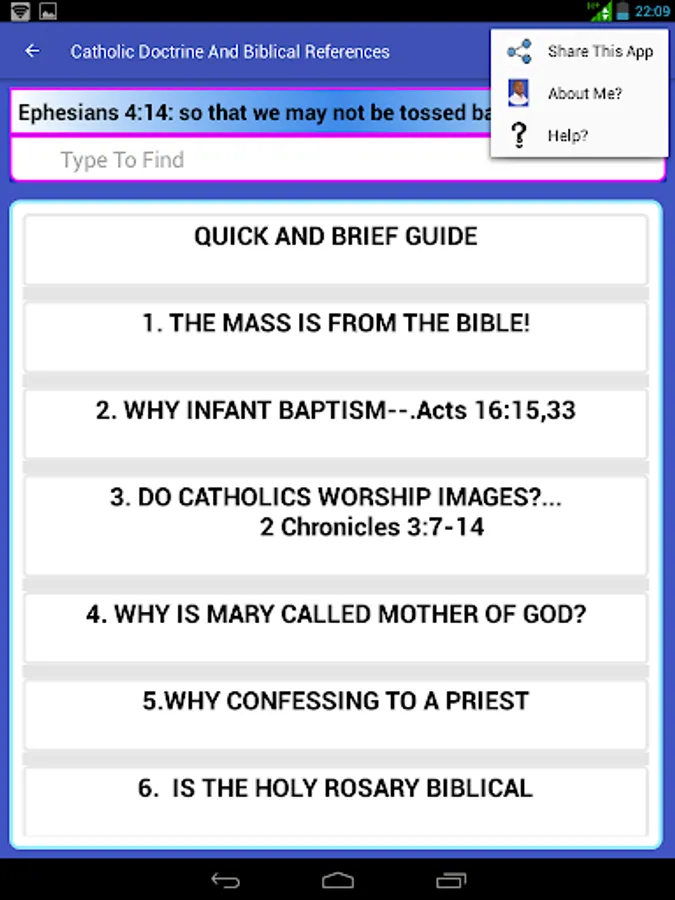 Catholic Doctrine and Biblical References is an app, which uses the scripture to explain Catholic faith/Doctrine issues like: Holy Rosary, Holy Eucharistic Celebration, PURGATORY, images, Confession, calling Rev Father, Holy water etc.