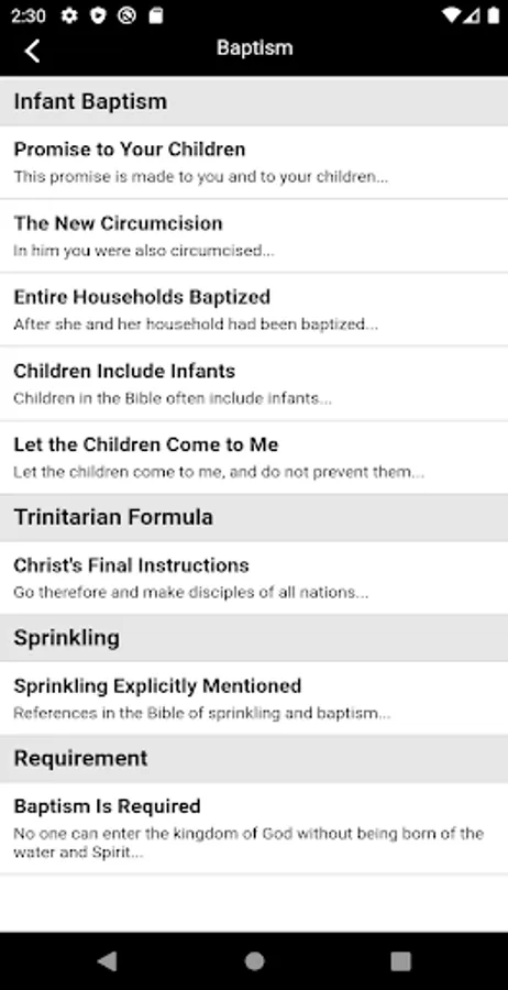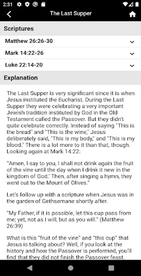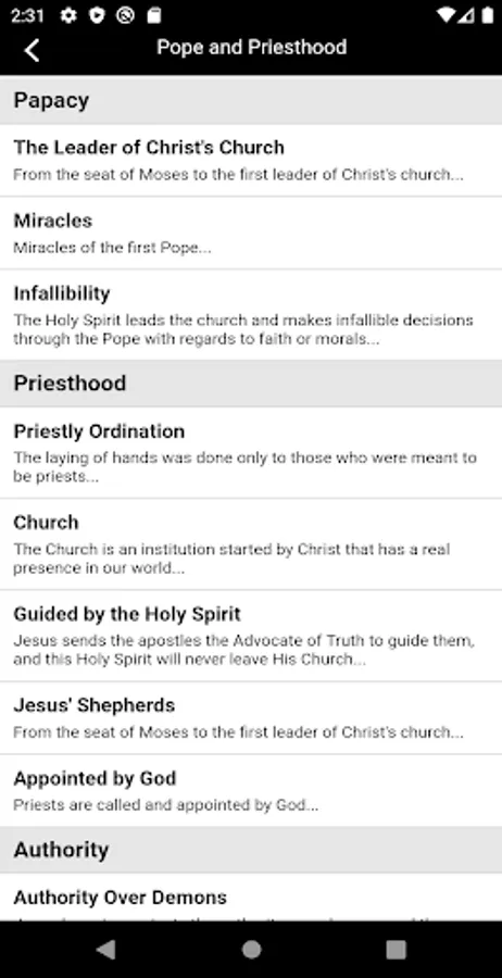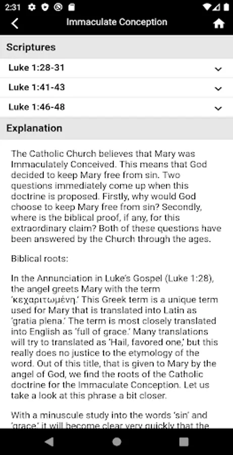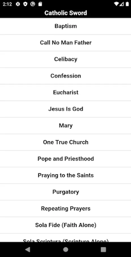 Catholic Sword Apologetics is the best app to defend the Catholic Church and answer common questions about the faith. The app covers topics such as Infant Baptism, Papal Authority, Praying to the Saints, the Eucharist, Mary, Purgatory, Faith Alone, Scripture Alone, and so much more using the Bible as it's primary source. Each topic contains a wealth of information to learn from and a list of scriptures to support the faith in a clear and concise manner. Scriptures contain quick key points to emphasize important aspects of the scripture and help make it more understandable. In addition, a further explanation is used to describe the link between all of the Bible passages and ties each topic together. Whether you are a Catholic looking to defend your faith, a Protestant looking to learn more, or a curious bystander, Catholic Sword Apologetics is an excellent tool to have.