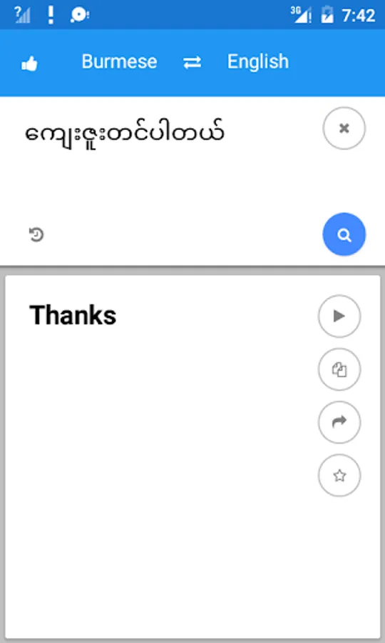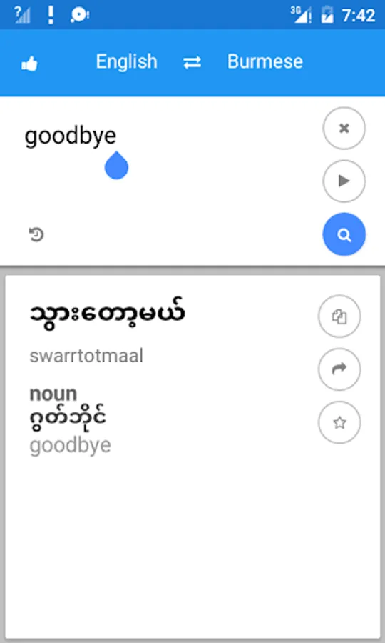 • Translate between Myanmar and English by enter the phrase and sentence, or paste clipboard contents.