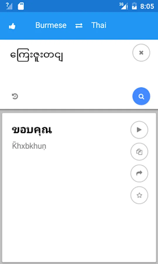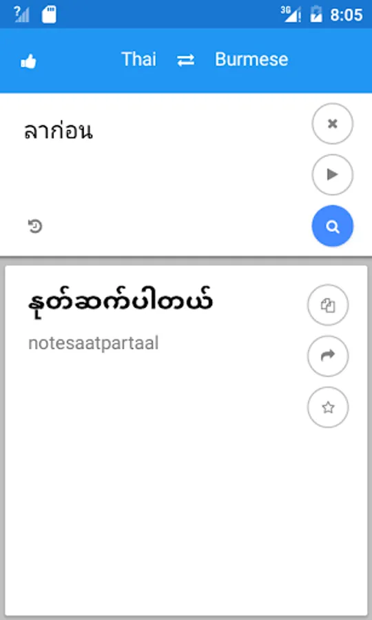 • Translate between Myanmar and Thai by enter the phrase and sentence, or paste clipboard contents.