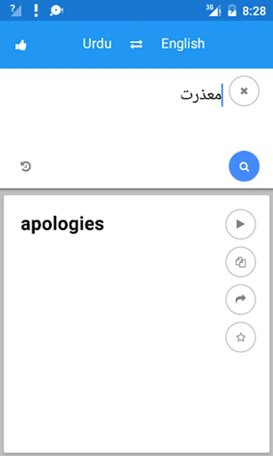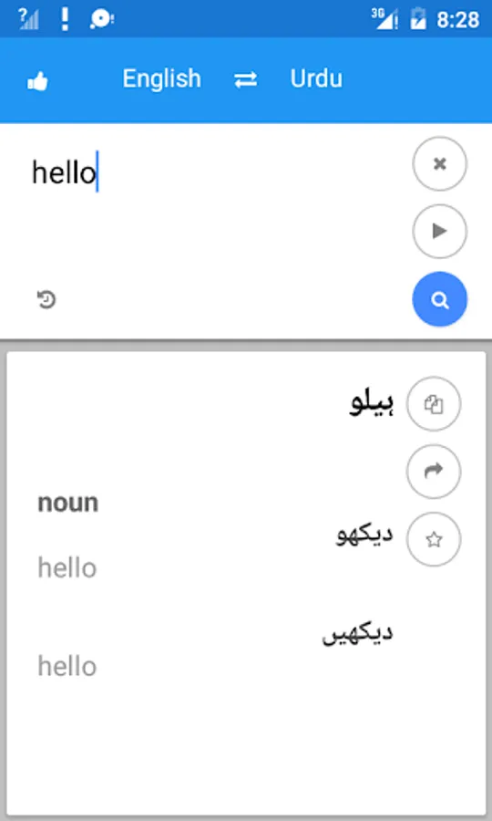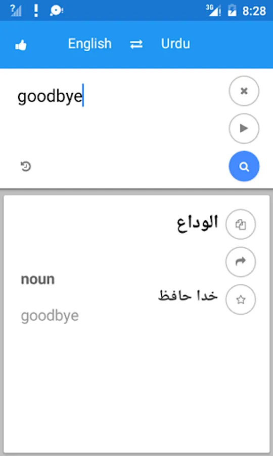 • Translate between Urdu and English by enter the phrase and sentence, or paste clipboard contents.