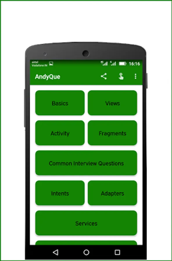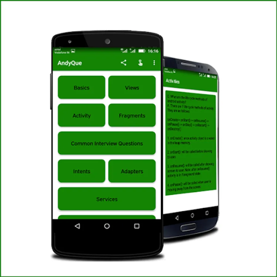 AndQue is Android interview questions app for the people who are looking for jobs in android development. You're at the right place if you are looking for the best app for android job interview questions and answers for freshers and experience.