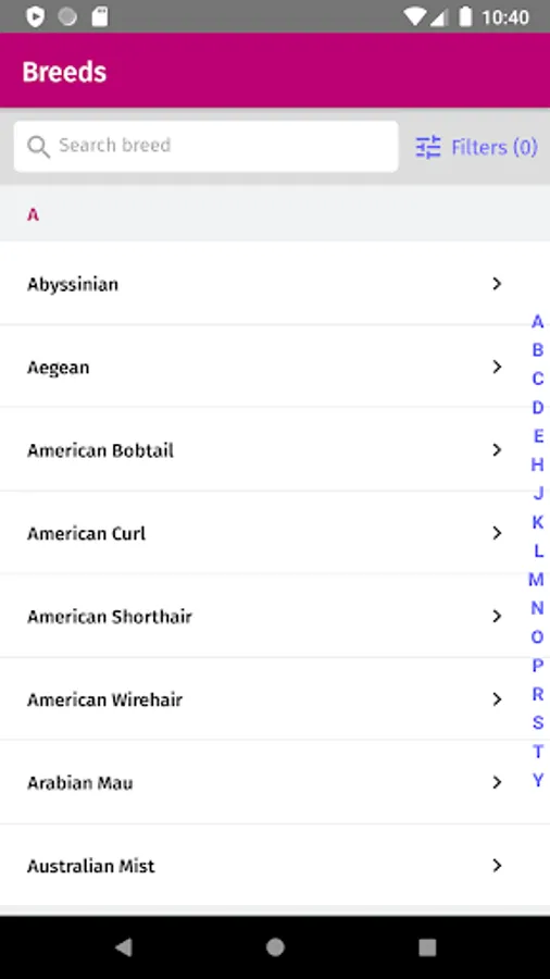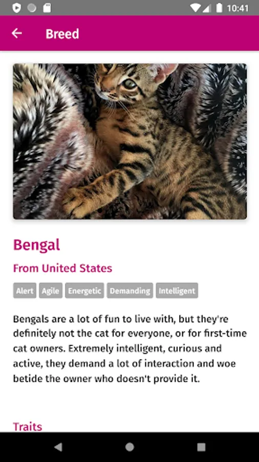 This app lists all cat breeds, with images, facts, description and traits. You can also filter all breeds by traits to see which cats could fit you.