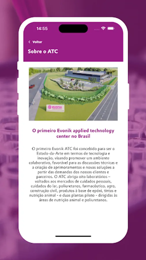 The Evonik Applied Technology Center (ATC) was designed to develop, with our business partners, innovations for essential markets, such as: agro, civil construction, home care, personal care, pharmaceuticals, polyurethanes, epoxy-based products, nutrition animal, paints, among others. Through the Evonik ATC for Visitors app, our customers and partners can schedule visits to Evonik ATC and access exclusive content about our products, services and laboratories.