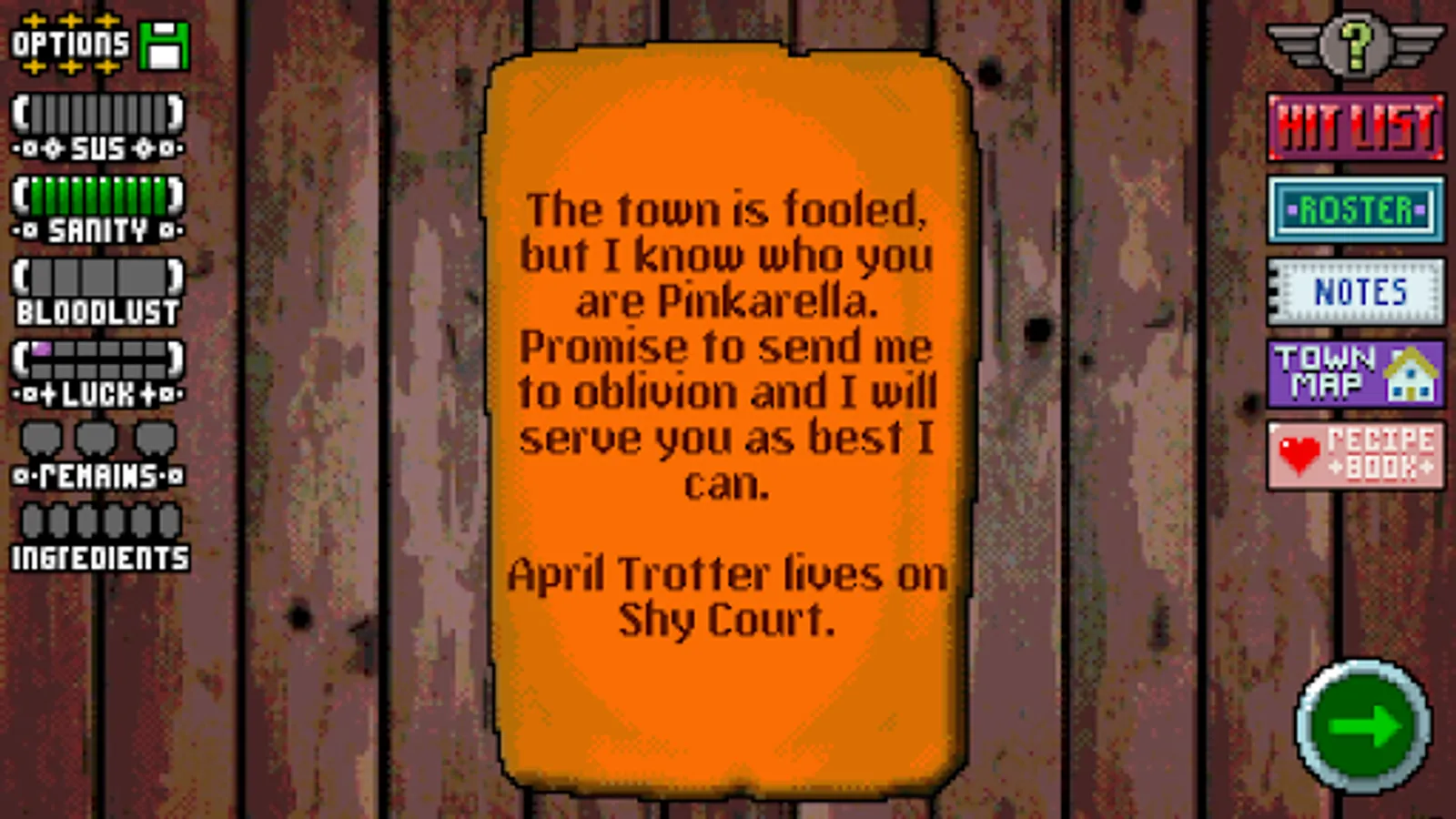 You are not alone - you have your faithful pet who can be sent out to perform tasks during the day while you work your trade as a confectioner. There is also a mystery pony in the town who is aware of what you are and has become a twisted fanatic. Your pet and this dark Disciple will help you learn the roles of the Town Council and where they live. Armed with this information you can decide who presents the greatest threat - if the town uncovers your identity, they will surely avenge themselves by lynching you!