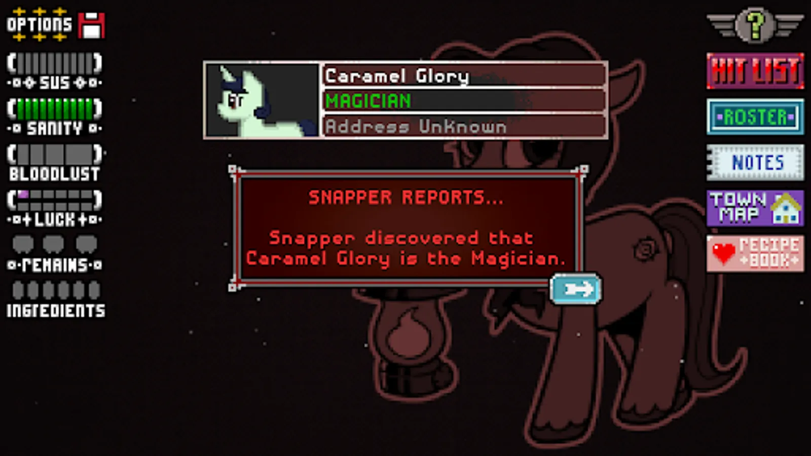 As the game progresses, the town becomes ever more dangerous and paranoid and will frantically increase their efforts to destroy you. Craft fiendish and irresistible cakes, drop in on the townsfolk and murder them, gaslight innocent ponies into doubting their own innocence, kidnap victims and lock them in your basement - they will probably try and barter for their lives with information. Hopeless, of course.