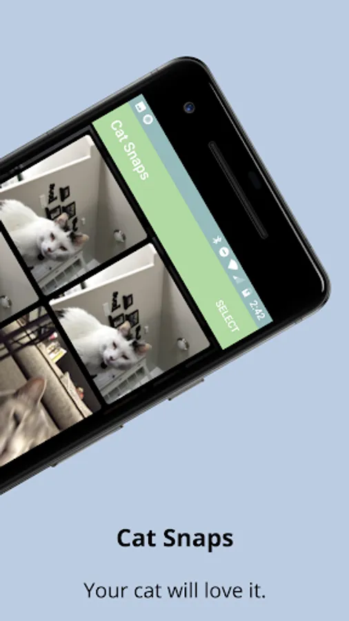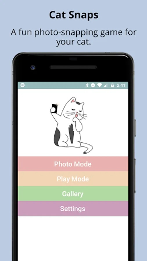 Cat Snaps puts taking photos of your cat into your cats paws. Let your cat play a simple game and when your cat taps the screen, Cat Snaps will take a fun and unique photograph of your cat.