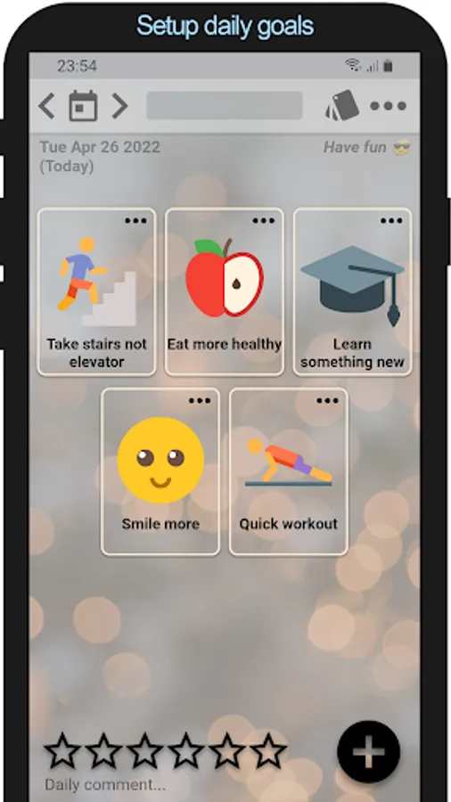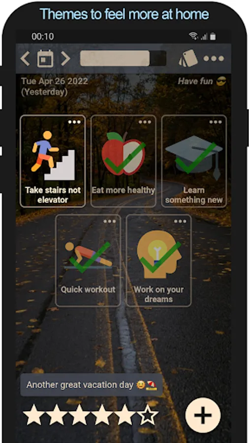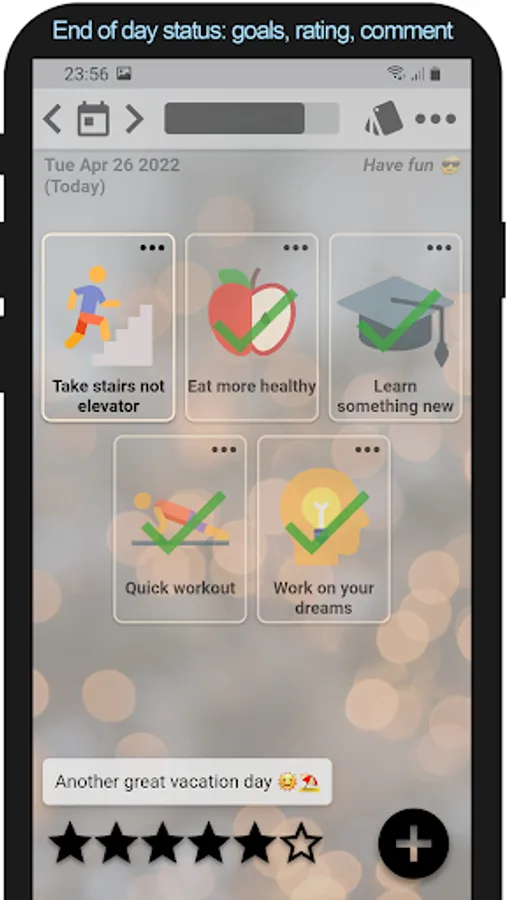 • Rate the day. Optional feature to rate (and reflect on) each day, by assigning 1 to 6 stars..