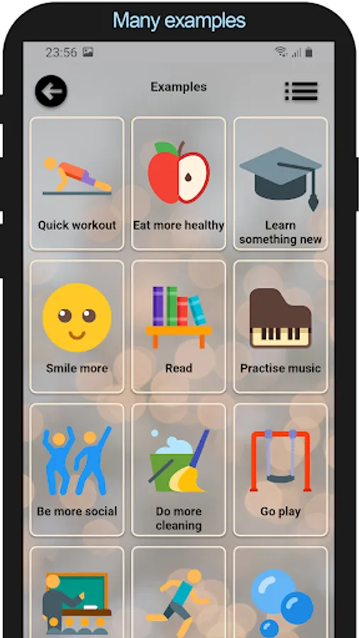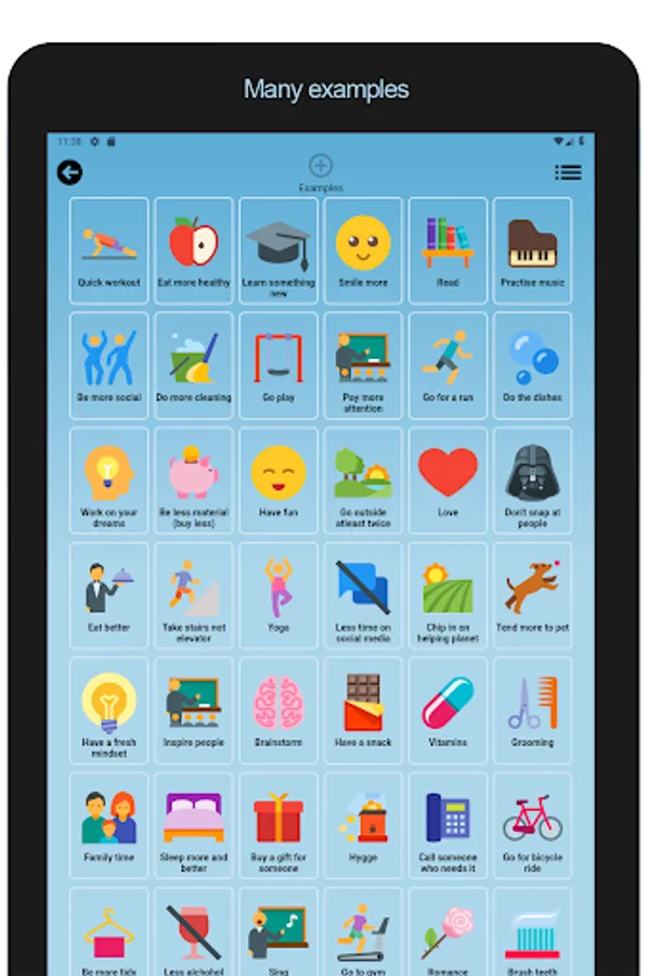 • Examples and categories. Find HabitGoal examples and images split into different categories for inspiration.