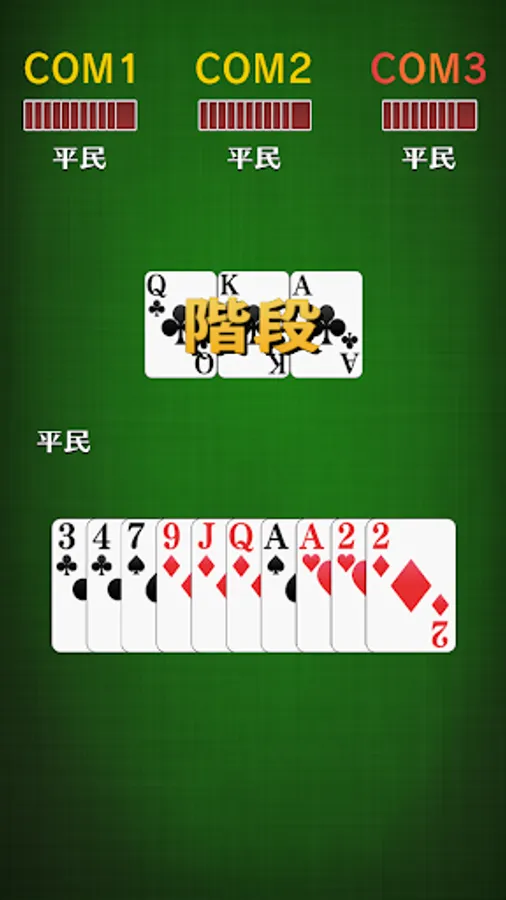 Three or more cards of the same suit and consecutive strength can be played at the same time. Strength of Stairs is the strongest card.