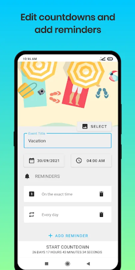 Countdown App is a days counter which lets you record your events, track it within app or pin countdown widget for home screen. It's a very simple app to countdown your events, holidays, anniversaries, christmas and others. You just select a background, enter a title and time. Then, Countdown App will start to count days for you. Also, you can add a countdown widget for your homescreen to track the event even if you don't open the app.