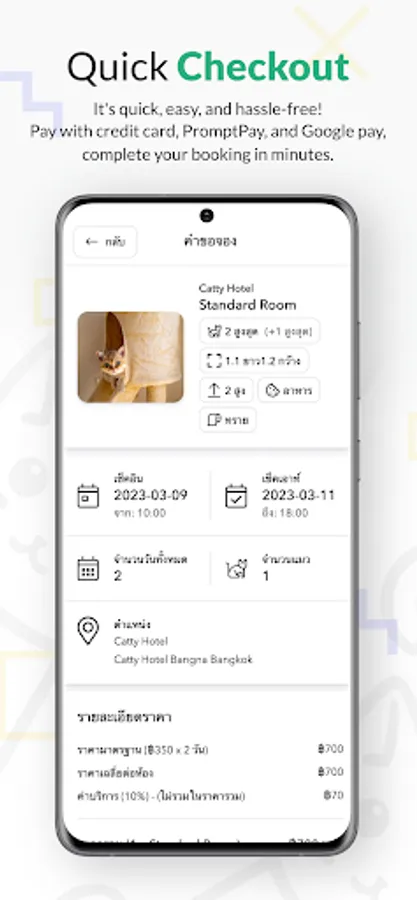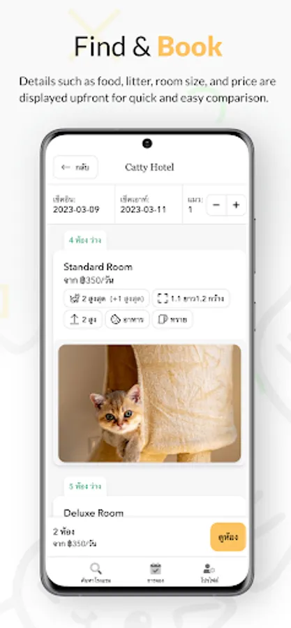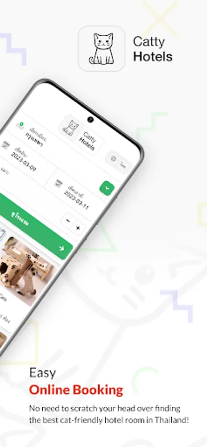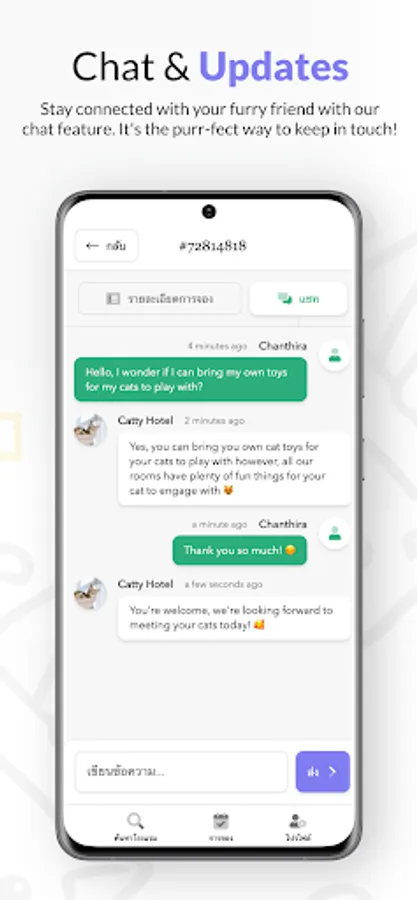 With our app, you can easily book a cat-friendly room anywhere in Thailand straight from your Android! Explore a variety of hotels, find the purr-fect room, and even track your kitty's stay with real-time updates and chat features. It's everything you need to keep your cat happy and pampered - right at your fingertips!