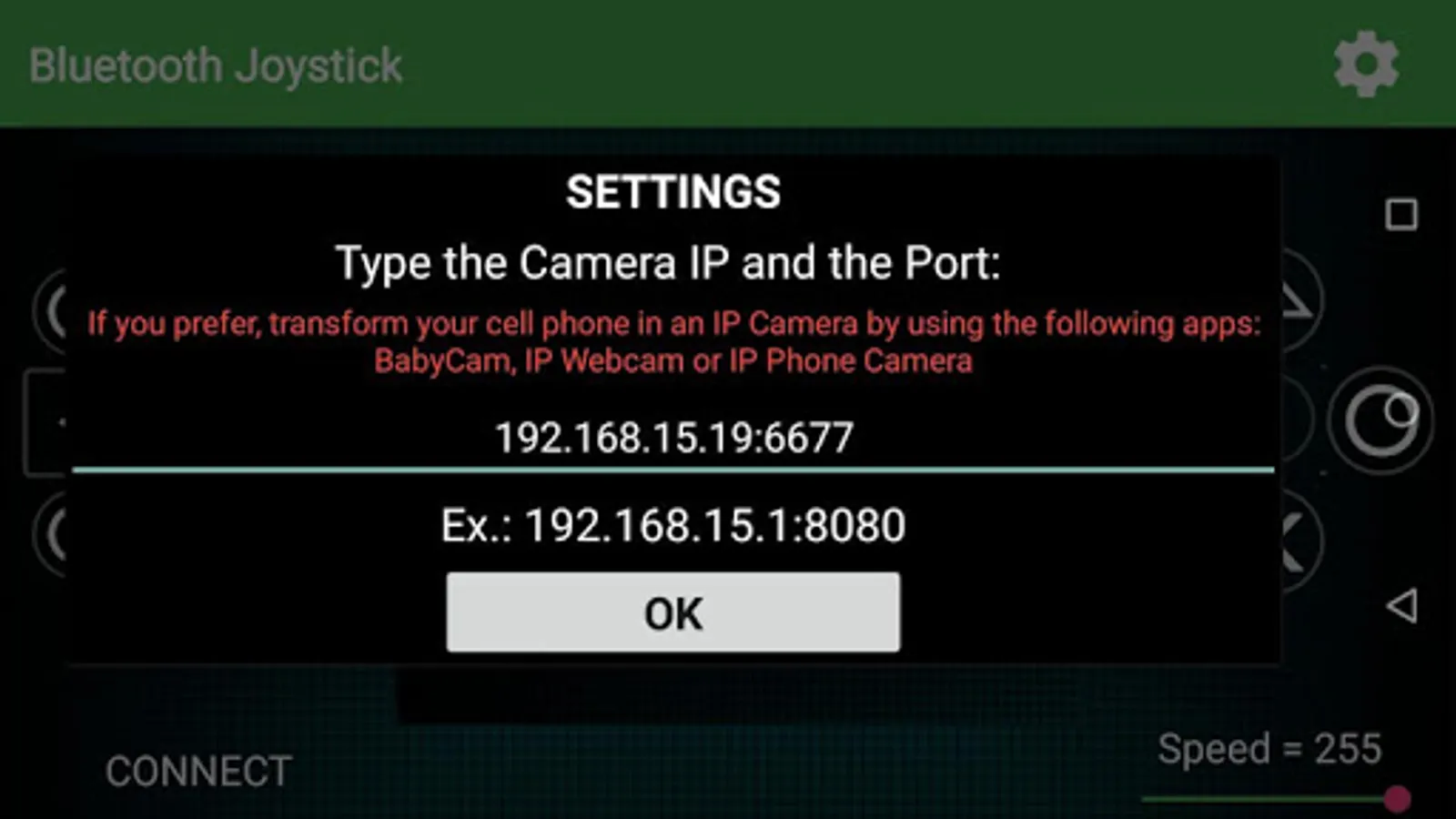 That app Ultimate Bluetooth Joystick - UBJ has been developed to control your car / toy / robot through the Bluetooth HC05, HC06, ESP32 and others. It is completely settable and easy to use. Besides controlling it, you can watch to your webcam in your mobile. Just imagine you controlling your BlueTooth device that is in another room and watching what a webcam installed the is broadcasting. All this in an easy and funny way. Download it now!