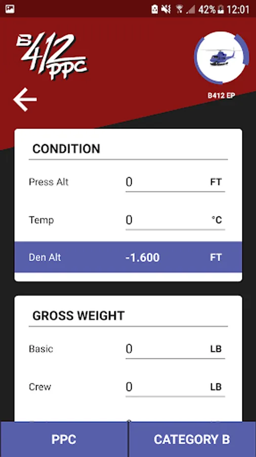 The calculations for this App were developed with the performance Sections 4 of the Manuals BHT-412-FM-3 & 4 (S/N 3620-36086 and 36087-Subsequent) and supplement BHT-412-FMS-35.3 & 35.4 (S/N 36020-Subsequent ; 33108-33213 & 36001-36019 modified). It was considered for all the HEATER OFF calculations according to their respective tables. Multiple tests have given minimum error, but always remember that results may contain errors.