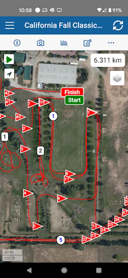 • Elevation profile displays the terrain along the course with kilometer markers, obstacles and compulsory flags