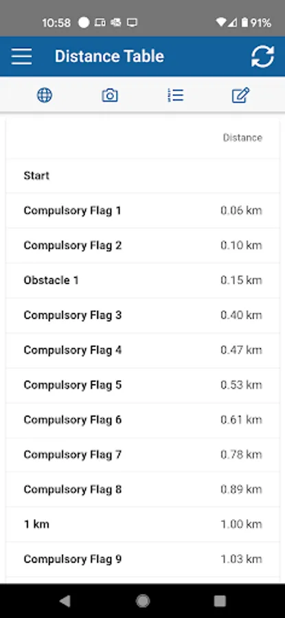 • Obstacle, compulsory flag and kilometer marker list with distances and times.