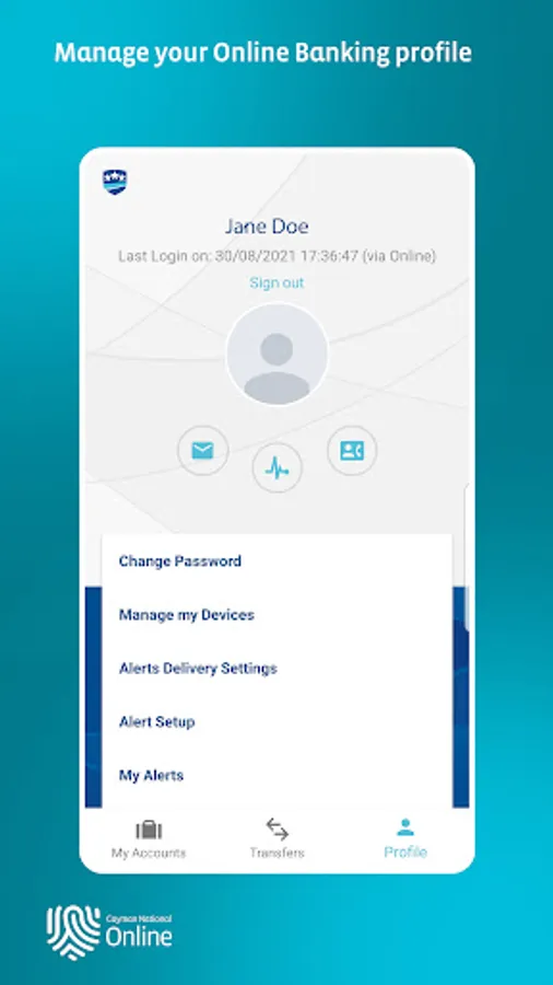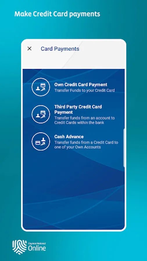 Welcome to Cayman National's new Mobile App, the easiest and most convenient way to bank. Available to you 24 hours a day, 7 days a week from the comfort of your own home, your office or anywhere you would like to bank. Plus, avoid waiting in the line at our locations.