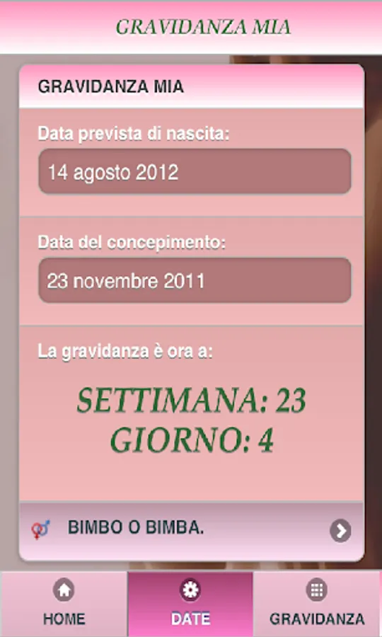 On this screen you must enter the date of the first day of the last menstrual period, which is necessary for the calculation of the expected date of birth, conception and gestation period of the current, weeks and days.