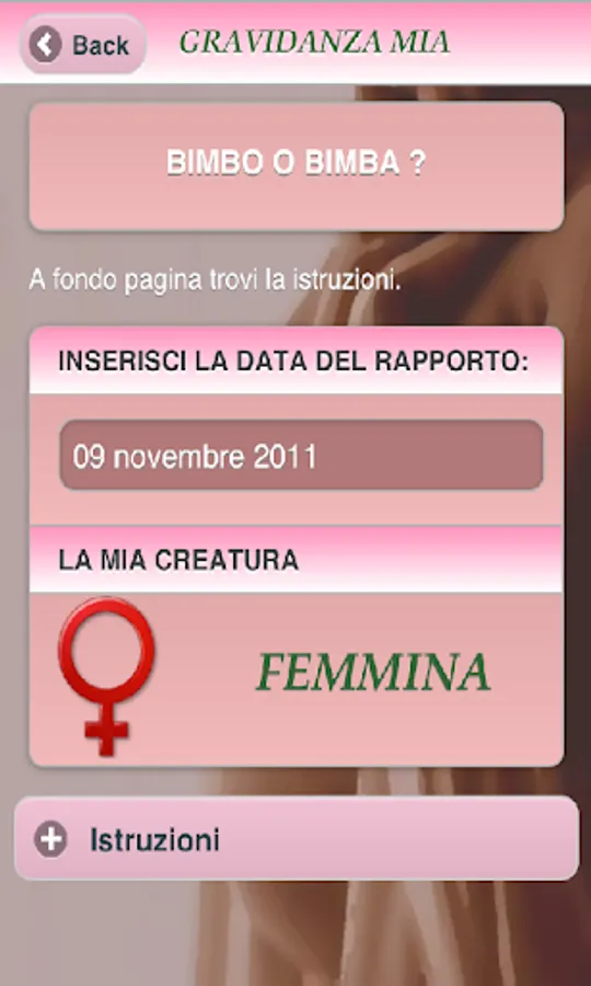 Inserting the date of the last report prior to ovulation, it is possible to give a probability value to the child's sex, of course, this result should be considered purely probabilistic like a game.