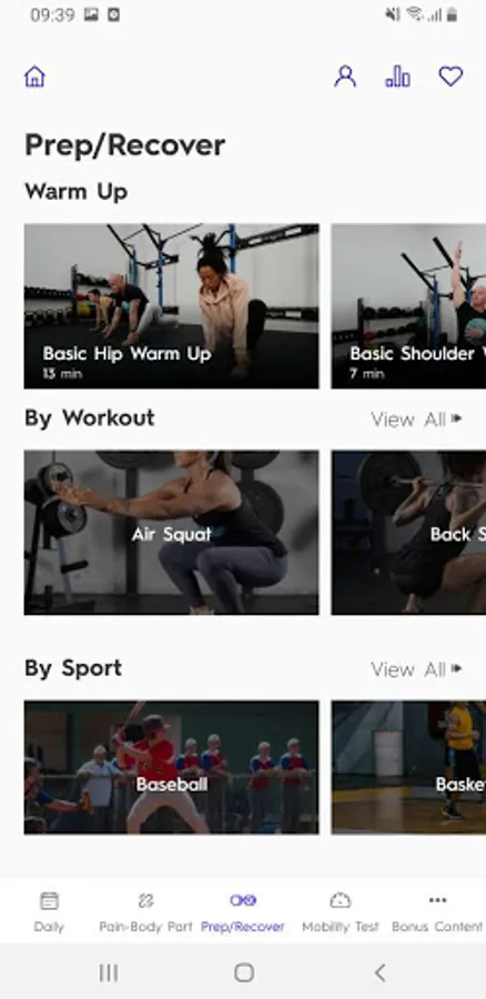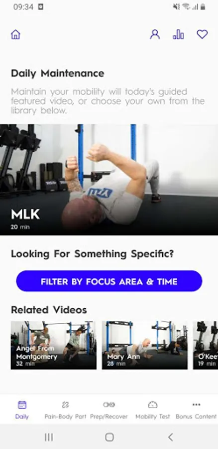 • Access a featured daily maintenance mobilization video, or choose your own with filters for both length and targeted body part.
