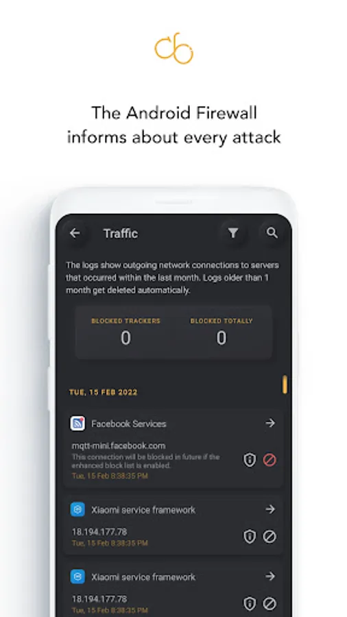 Because VpnService is used, Android may show a “VPN” indicator while the firewall is active. This is expected and required for local traffic filtering.