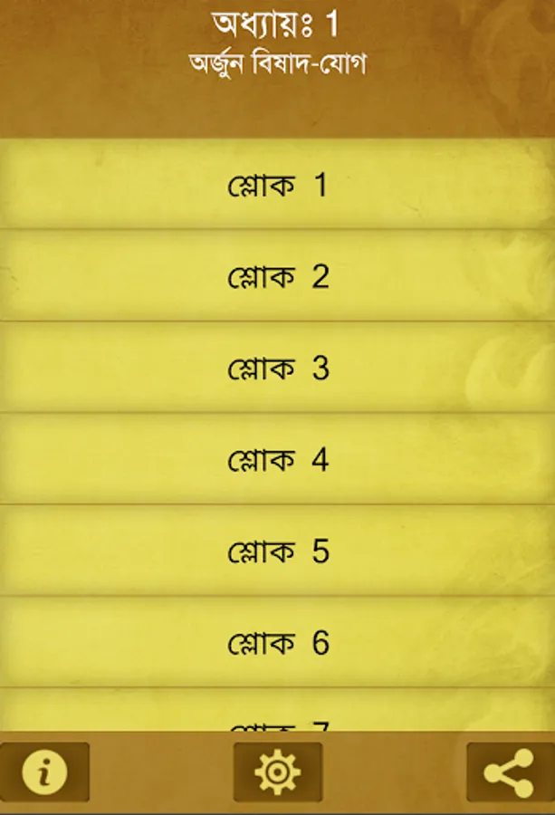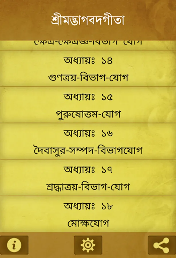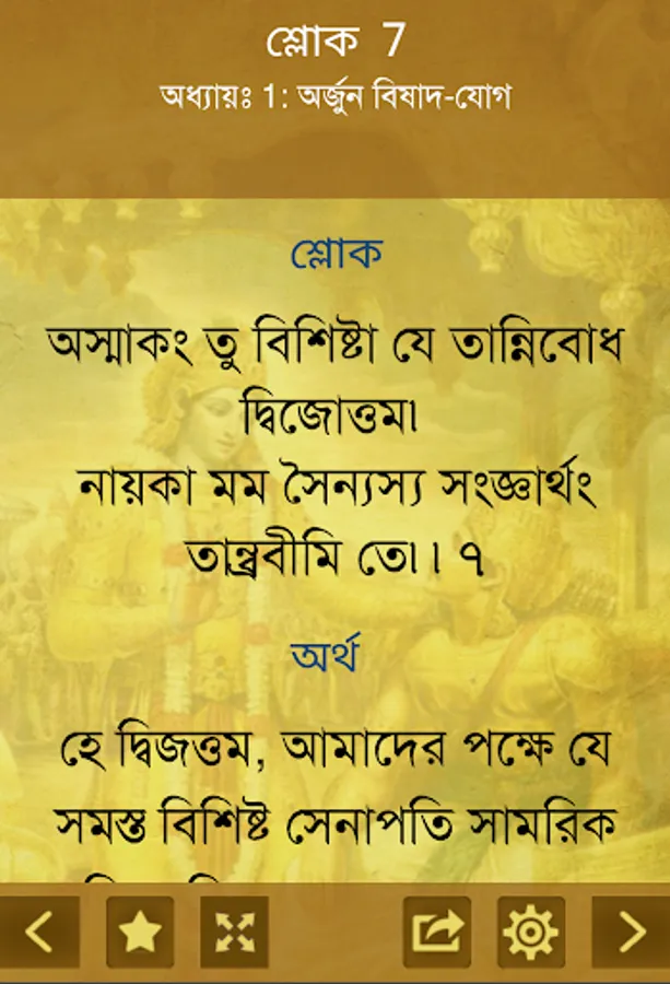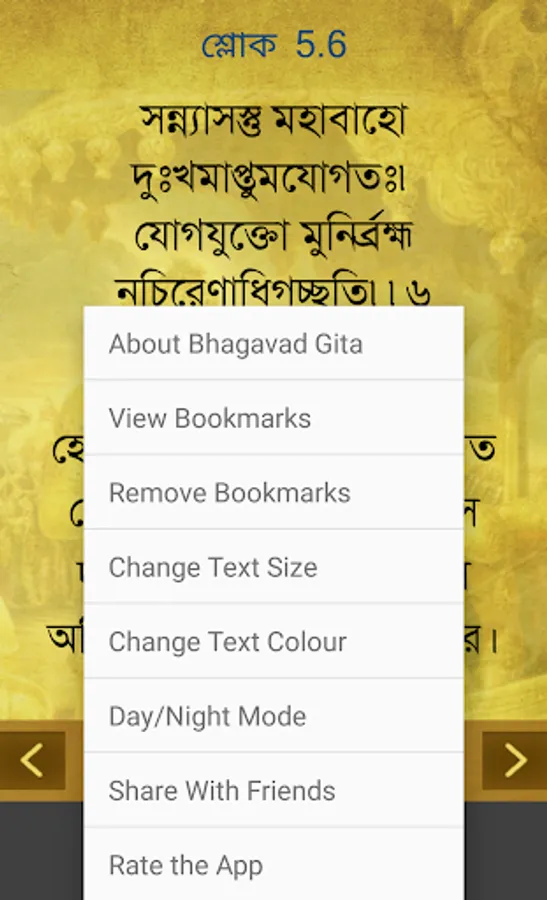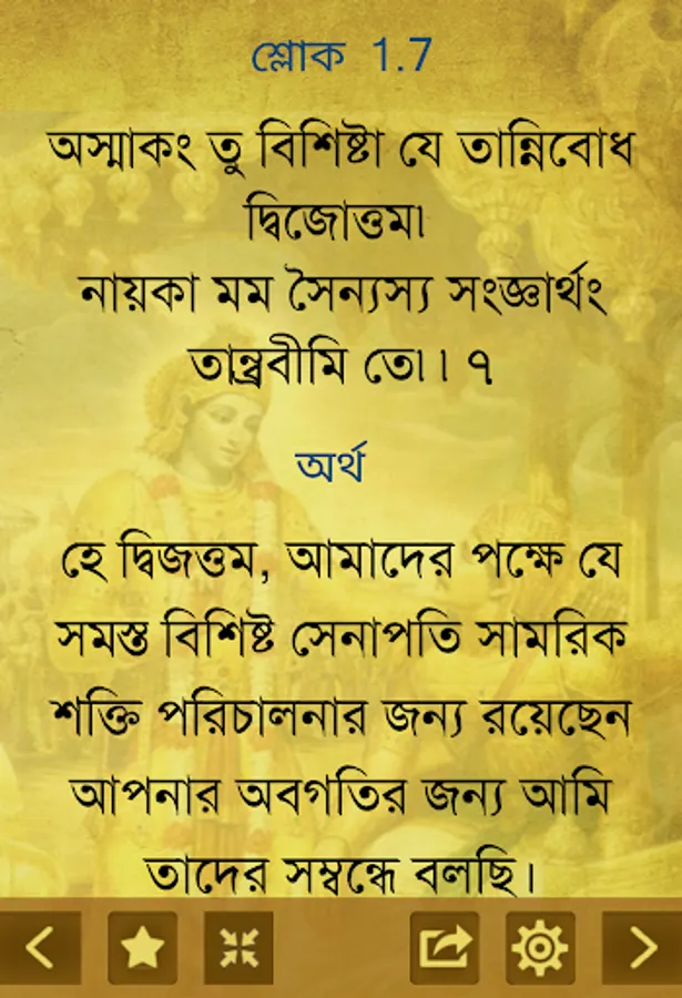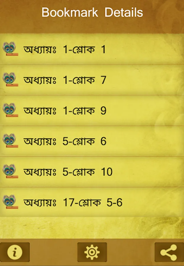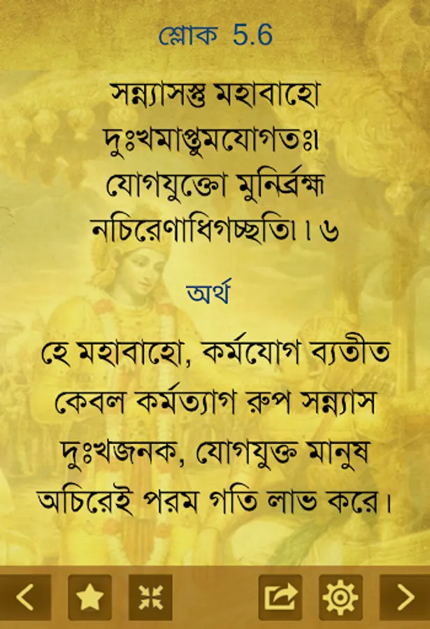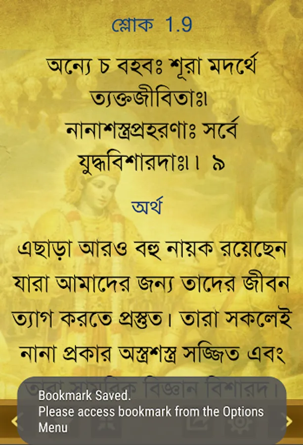 Forgot from where you left reading? You can resume reading Bhagavat Gita Bangla from the point where you left. Press the star icon[see screenshot] on the Shloka Page and the Shloka will be bookmarked. You can resume reading by selecting "Go to Bookmark" option from the Menu